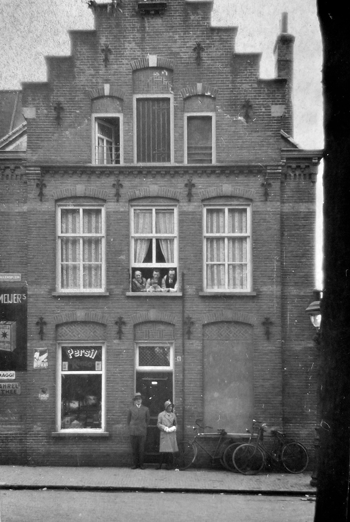 De familie Maas woonde op de eerste verdieping. De kruidenierswinkel op de begane grond was in 1928 van F.H. Boutier en had als adres Bondstraat 1. In het open raam op de eerste verdieping mijn grootmoeder Maria Geertruida Maas - van den Berg, mijn oom Thom (later van Drukkerij Thom Maas aan de Zuidwillemsvaart 34) en mijn grootvader Petrus Johannes Maas, timmerman in het Grootziekengasthuis. Het kleine meisje voor Thom is mijn nicht Mia geboren Dirks. De man bij de deur op de begane grond is mogelijk mijn oom Peter en als dat zo is zou de dame naast hem Cis van den Heuvel (van het caféetje naast het stadhuis) kunnen zijn. |