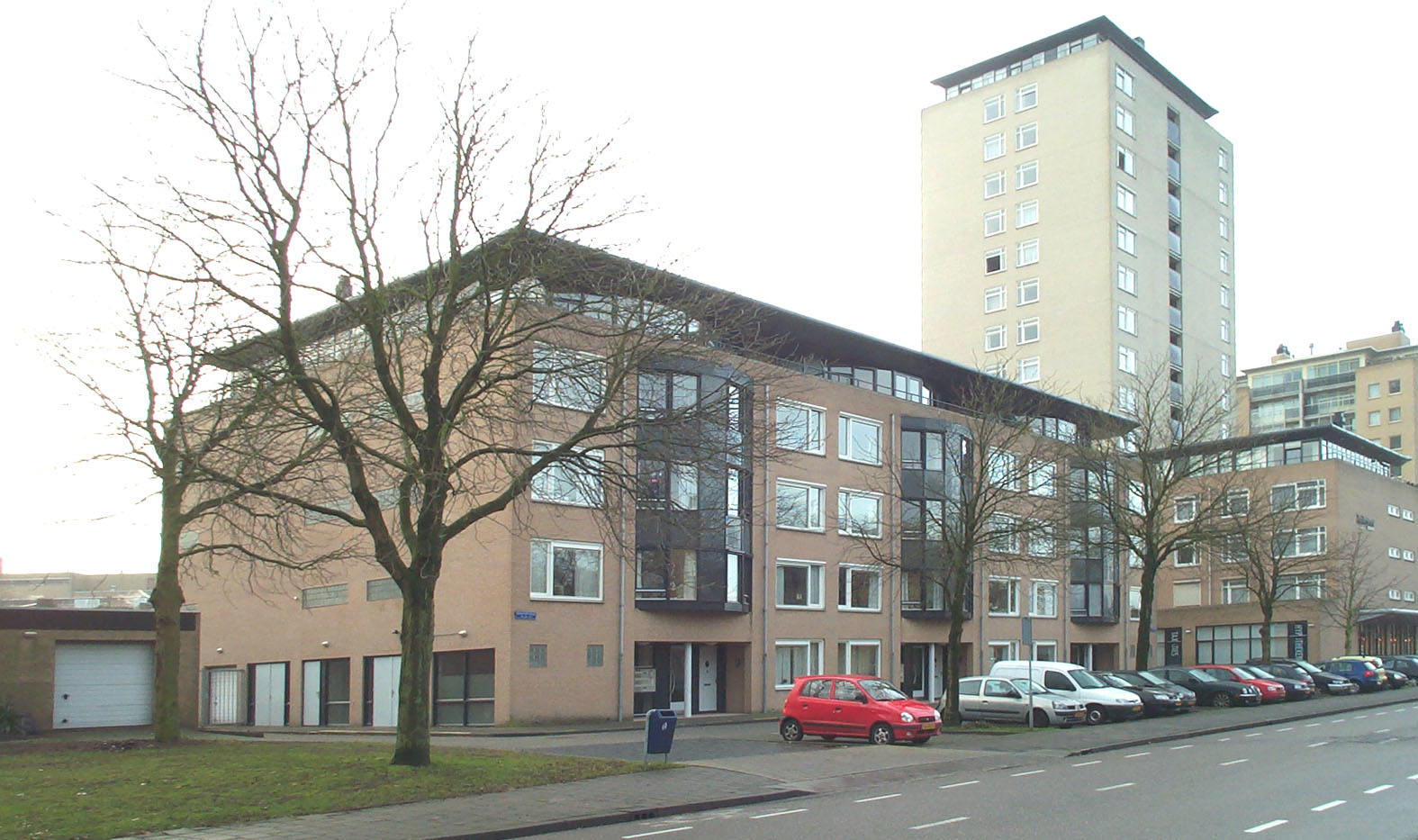 Appartementen complex in 5 bouwlagen en platdak. De eerste bouwlaag bevat de toegangspartijen en kleine bedrijfsruimten en vier appartementen. In de 2e, 3e, 4e en 5e bouwlaag zijn alleen appartementen ondergebracht, waarvan de 5e bouwlaag is ingericht met penthouses. Opvallende zijn de gebogen erkers in 2e, 3e en 4e bouwlaag en het overkragende platte dak.
