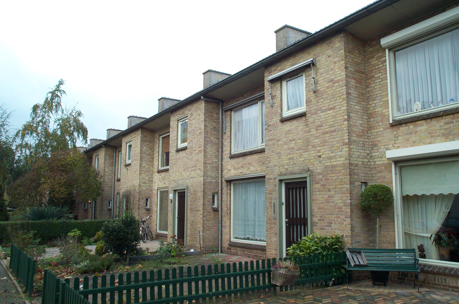 Tussen de blokken een brandgang. Alle woningen zijn gerenoveerd en in uniforme staat. Het geheel is uitgevoerd in schoonmetselwerk in een blonde metselsteen.
