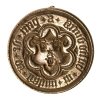 zilver, gegoten, gesneden diameter: 2.5 cm dikte: 0.2 cm hoogte: 1.5 cm gewicht: 12.8 gr Rond zegelstempel met aan de achterzijde een eenvoudig bewerkt handvat (voluutvormig met twee ronde en twee 'visblaas' openingen) en in gotisch schrift: s + petri + de + os +. Aan de voorzijde een omschrift met aan de buitenzijde een band van drie cirkels. Op een versierd veld omsluit een zespas een renaissanceschild. Heraldische beschrijving: drie ossekoppen, geplaatst 2-1; in het hart van het schild een vijfpuntige ster. |