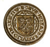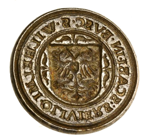 zilver, gegoten, gesneden diameter: 2.8 cm dikte: 0.2 cm hoogte: 2.4 cm gewicht: 19.8 gr Rond zegelstempel met aan de achterzijde een bewerkt handvat (halfrond filigrainwerk) en gegraveerd: • WILHELMI • OLIVIERS • 1596 • . Aan de voorzijde een omschrift tussen twee banden van twee cirkels. Op een versierd veld een half-cirkelvormig schild. Heraldische beschrijving: een dubbele adelaar. |