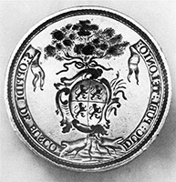 In 1761 sneed Theodor Victor van Berckel voor de stad 's-Hertogenbosch een tolzegelstempel, dat de bosboom toont waarin het wapen met de twee Brabantse en de twee Limburgse leeuwen hangt. Op de banderol staat de tekst: 'S.OPPIDI DE BUSCO DUC. PUBL. TELONIO'. Dit zegelstempel was door het stadsbestuur besteld bij de medailleur Theodoor Everardus van Berckel, die tevens als zilversmid in het gilde van de goud- en zilversmeden was ingeschreven. Deze liet het echter door zijn zoon Theodor Victor, die niet officieel als zilversmid in Den Bosch heeft gewerkt, vervaardigen. Het eigenlijke stempel is gesneden in een zilveren plaatje dat tegen een ijzeren houder is gemonteerd. | 251 |