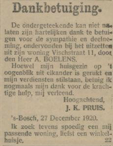 De huurder van het pand in de Visstraat moet wel erg boos geweest zijn dat hij door Antoon Boelens uit het pand gezet is. Hij plaatst een advertentie in de krant van 27 december 1920: