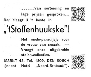 In 1934 werd weer een echte zaak begonnen, en wel ‘Het Stoffenhuukske’ op Markt 43. Er was tevens een bontatelier aan verbonden. Dit tot grote ergernis van Antoons zuster Marie van der Ven-Boelens die al een bontzaak op de Markt had. Het Stoffenhuukske was gevestigd in een pand dat later opgenomen werd bij Hotel Noord-Brabant. Als je Hotel Noord-Brabant binnenging door de draaideur aan de rechterzijde, dan betrad je het gedeelte dat vroeger Het Stoffenhuukske van Toon Boelens was. Hotel Noord Brabant bestaat niet meer. Het pand herbergt nu C & A, naast Hotel Central. Het Stoffenhuukske was, in tegenstelling tot wat de naam doet vermoeden, een enorm groot pand, even diep als C & A nu is en had twee verdiepingen, met daarboven nog een zolder. Het was een grote winkel, met een toonkamer, daarachter een lange gang met een ontzettend grote huiskamer. Het bontbewerken gebeurde boven. Ook Jo werkte mee om bontmodellen te maken. In 1937 is Antoon Boelens failliet gegaan in zijn Stoffenhuukske.