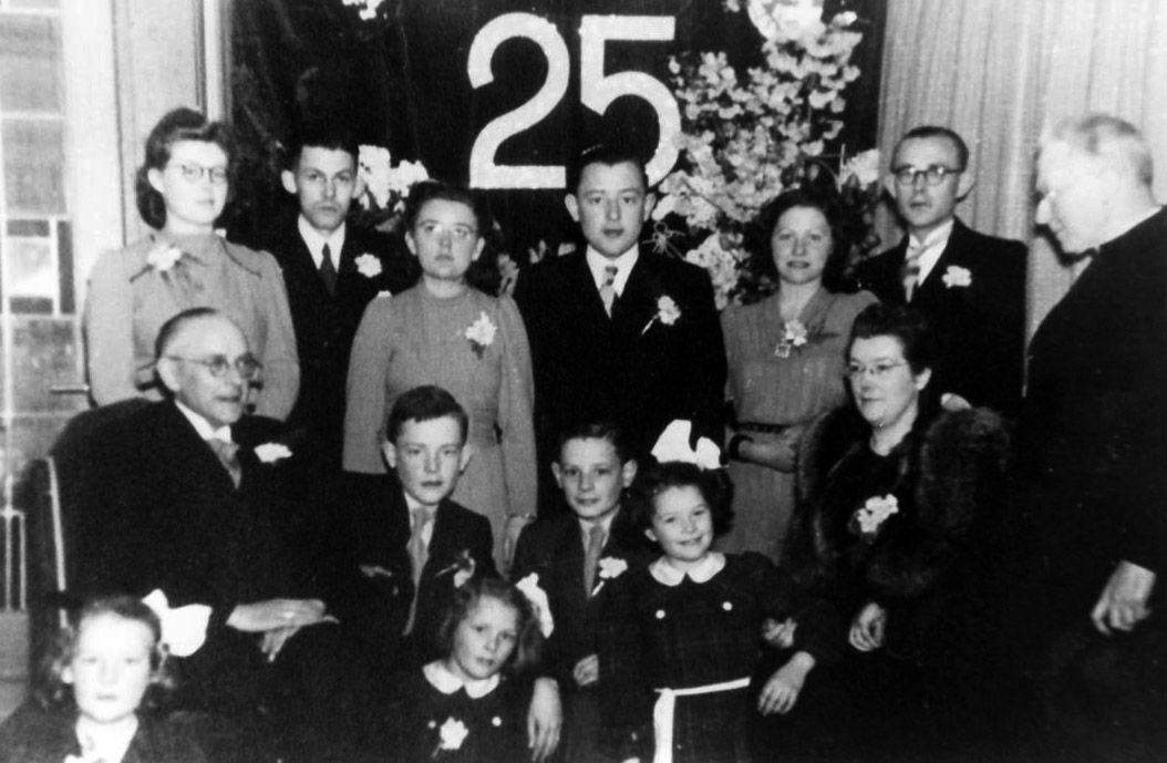 ![body=[]](documenten/boelens, antonius wilhelmus catharina (1897-1958)/005.jpg) Zilveren bruiloft Antoon en Jo Boelens-Poot in 1946, achter staande v.l.n.r. Ans Boelens, Sjef Strijbosch, Esther en Jan Boelens, Riekie Steijlen, Ben Boelens, pastoor De Kroon van de St. Pieter, zittend, vl.n.r. Antoon Boelens, Ton, Christ en Jacqueline Boelens, Jo Boelens-Poot, zittend op de grond, links: Willy en rechts: Lenie Boelens; dochter Joke Boelens was afwezig.