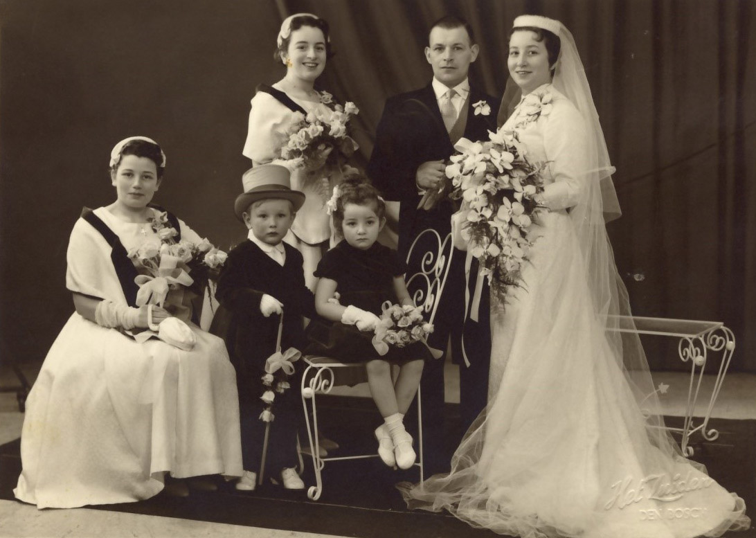 ![body=[]](documenten/boelens, catharina johanna wilhelmina (1929-2003)/001.jpg) Huwelijk Toos en Koos Smit-Boelens, bruidsdames: Fief Boelens (links) en José Boelens (zussen van de bruid), bruidsjonker: Joop Boelens (zoon van Ben), bruidsmeisje: Jacqueline Schiltmans (dochter van Annie).