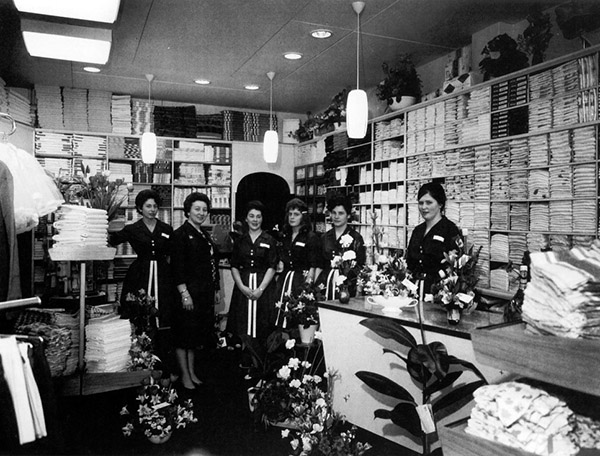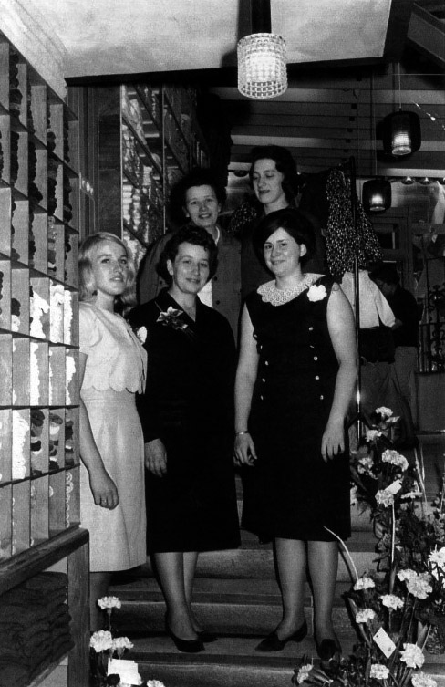 ![body=[]](documenten/boelens, catharina johanna wilhelmina (1929-2003)/004.jpg) Toos Smit-Boelens (2e van links) met personeelsleden bij de opening van de zaak Hinthamereinde (1962)
