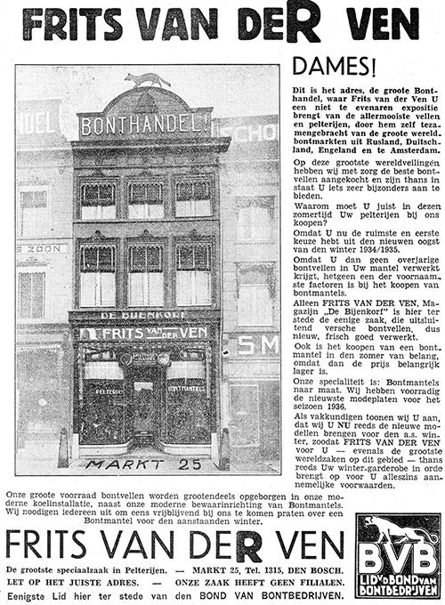 Bijna alle bonthandel in Amsterdam was in Joodse handen. Een van de beperkende maatregelen, die al in het begin van de oorlog de Joden opgelegd werd, was, dat ze geen zaken meer mochten doen met het buitenland. Heel veel bont kwam uit België. Marie en Frits zijn voor Joodse firma's uit Amsterdam in Gent konijnenvellen gaan kopen. Zij hadden daar al contacten liggen en kenden verschillende fabrieken die konijnenvellen bereidden en verfden. Zij exporteerden veel naar Engeland. Die export lag natuurlijk ineens plat door de oorlog. Dit was aanleiding voor Frits om vrij snel na het begin van de oorlog daarheen te gaan om te zien wat er met die handel zou gaan gebeuren. Ze begonnen met een DKW vol bont, waarmee ze van Gent via een tussenstop bij hun huis in Den Bosch naar Amsterdam reden. Deze handel ontwikkelde zich zo, dat ze uiteindelijk vrachtwagens vol bereide konijnenvellen naar Amsterdam lieten vervoeren. Ze waren dus tussenhandelaren. De Joodse firma's waren daar natuurlijk ontzettend blij mee, want die konden op die manier hun zaken nog laten doordraaien. Diverse van die Amsterdamse bedrijven deden al zaken met de ouders van Marie. Er werd erg veel geld verdiend. Frits was zo verstandig om met het geld panden te kopen, ook wel omdat Marie het nogal makkelijk en snel uitgaf en door panden te kopen was het goed belegd. Tot de eerste panden die ze kochten behoorden twee huizen op de Hekellaan. Toen de handel op volle toeren draaide, sloten op een gegeven moment (waarschijnlijk in 1941) de Duitsers de grenzen en viel ook die geldstroom droog. Door de veldtocht in Rusland hadden de Duitsers behoefte aan bont voor binnenvoering van militaire kleding. Duitsers van het ‘Wehrmachtsbeschaffungsambt’ kwamen bij Frits van der Ven en vroegen hem om gebruik te maken van zijn relaties in Gent. Hij zou dan de totale verantwoordelijkheid krijgen voor de import van bont voor de Duitsers, als hij maar met hen wilde samenwerken. Frits heeft dit geweigerd. Er was veel geld mee te verdienen. Ze zijn ook onder druk gezet om voor de Duitsers te produceren. Ook dit hebben ze geweigerd.