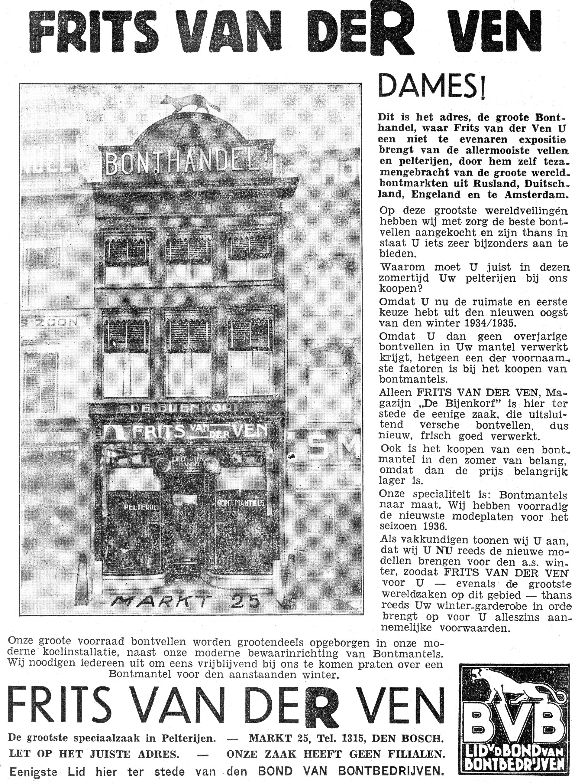 Midden 1946 wordt de hele winkel Markt 25 verbouwd. Tot die tijd was er direct achter de winkel een huiskamer. 's Winters werden de schuifdeuren opengeschoven en werd die huiskamer bij de winkel getrokken. Men gebruikte dan privé meer de salon op de eerste etage. Vanwege de grotere voorraden in de wintermaanden kon men aldus in dat seizoen over een grote winkelruimte beschikken. 's Zomers werd het weer huiskamer, daarachter was een binnenplaats en daarachter de keuken en het bontatelier. Bij de verbouwing in 1946 wordt het hele voorhuis winkel. Het bontatelier verhuist naar de 1e en 2e etage van het Verenigingsgebouw. Men produceert dan al echt in het groot bontmantels, die men aan de warenhuizen en grote concerns verkoopt. Later toen in Amsterdam de Joodse firma's die handel weer gingen opstarten, werd de groothandelsfunctie van Frits van der Ven wat minder, maar het bontatelier is wel blijven bestaan. De binnenplaats en de keuken bleven gehandhaafd en het vroegere bontatelier werd een grote huiskamer met daarin o.a. een royale tafel met vijftien stoelen. Vader, moeder en dertien kinderen, 8 zonen en 5 dochters. Ieder kind had een stoel waarop zijn/haar eigen naam stond. De zonen hebben alle acht op kostschool gezeten op ‘de Ruwenberg’ in St. Michielsgestel. Ook de dochters zaten op goede scholen en internaten.