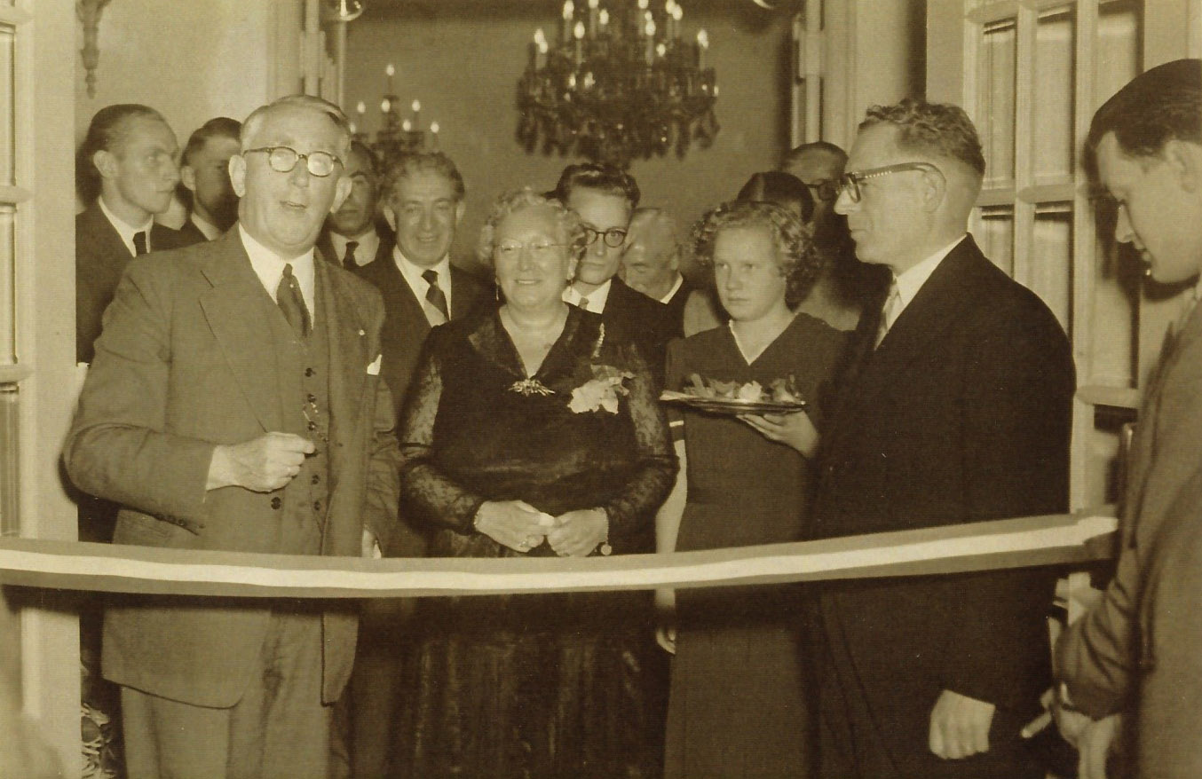 ![body=[<b>Bron:</b> Joop Boelens]](documenten/boelens, maria anna christina (1901-1989)/004.jpg) Opening Modehuis Frits van der Ven, Kerkstraat; links burgemeester Mr. Loeff, midden Marie Boelens en haar dochter Mieke van der Ven, rechts (met bril) Frits van der Ven (1949)