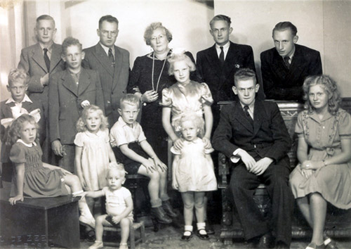 ![body=[<b>Bron:</b> Joop Boelens]](documenten/boelens, maria anna christina (1901-1989)/005.jpg) Het gezin Van der Ven-Boelens op 31 augustus 1947: Achter staand: Christ, vader Frits, moeder Marie, Jan en Frits jr., zittend rechts: Ben en Ans, zittend links: Bea, Stephan en Clemens, achter Bea: Henk, rechts van hem: Ad met voor zich staande: Gemma, in het midden met satijnen jurk: Mieke met voor zich: Bernadette