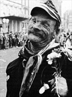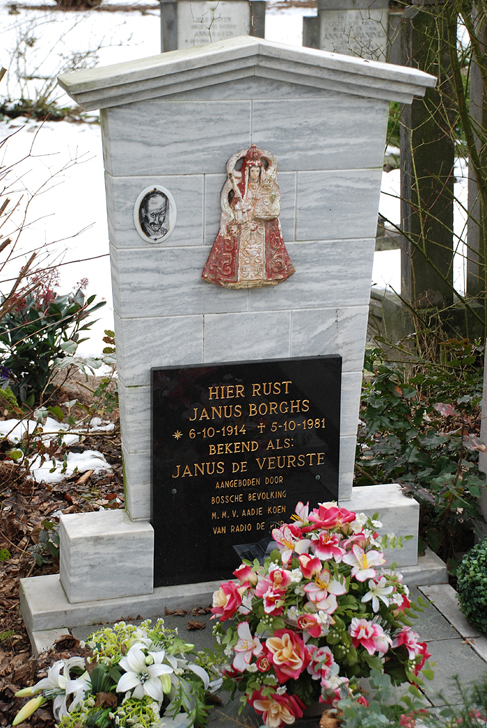 Janus' levensloopJanus is op 6 oktober 1914 geboren in een van de bovenhuizen aan de Beurdsestraat westzijde. Hij is de zoon van Marinus Borghs en Antonetta (Netje) Vorstenbosch, die op 5 juni 1914 waren getrouwd. Marinus, is na ontuchtige handelingen met kinderen te hebben gepleegd, uit de stad vertrokken. In 1970 is hij overleden. Na de scheiding in 1921 is Netje Vorstenbosch een jaar later voor de tweede keer getrouwd met gemeente-arbeider Marinus de Mol, die op carnavalsmaandag februari 1944 dronken van de stadswal tuimelde en overleed. Janus: „Als je toch moet sterven dan liever niet op carnavalsmaandag."Zijn moeder overleed op 27 oktober 1950. De verminking aan zijn gezicht liep Janus op achtjarige leeftijd op, toen hij zo wild als ie was, zich aan een kachel verbrandde. Boze lippen beweren, dat zijn moeder die overdag gedroogde appeltjes en peertjes op de markt verkocht, haar kind vastbond aan de rand van het keukenfornuis. Toen zijn stoeltje een keer omviel moet het ongeluk zijn gebeurd. In de oorlogsjaren hielp Janus zijn stiefvader op de veemarkt bij het koeien drijven. Behalve als ceremoniemeester tijdens optochten en processies kreeg Janus vooral als bloemenverkoper bekendheid. „Maar de opkomst van bloemenstalletjes bij de benzinestations maakte mijn handel kapot", zei hij. Op woensdag 7 oktober 1981 nam een volle St. Jan afscheid van een even verguisde als geliefde Bosschenaar. Op het kerkhof in Orthen is het graf van Janus en staat dichtbij de ingang een grafmonument, dat na een actie door Ben van Gulik van Radio De Pijp, is bekostigd. | 30 |
