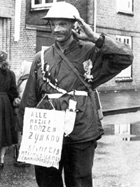 Hij had een bijzondere verering voor de Zoete Moeder van Den Bosch en het koninklijk huis. Je zou hem zelfs de heilige onder de Bossche typen kunnen noemen. Janus Borghs was koningsgezind. Zijn voorliefde voor Oranje zette hij om in felicitatiewensen op de verjaardagen van leden van het koninklijk gezin. Op de hoogtij dagen van Oranje droeg Janus steevast een oranje rozet en sjerp. Die uitmonstering hield hij ook in de oorlogsjaren aan, maar dan wat subtieler met de voorletters van Juliana en Bernard, die toevallig zijn eigen initialen waren. Dergelijke vertoningen leverde je zonder meer een proces verbaal op van de eerste de beste Duitse soldaat. Maar tegen de breedvoerige uitleg van Janus Borghs kon zelfs geen Oberstfeldwebel op. Na de oorlog ondernam Janus pogingen een politieke partij op te richten. Zijn genegenheid voor Maria voerde hij door tot in de naam van de partij: „Onder bescherming van Maria". De kandidaatstelling dreigde zo'n succes te worden, dat er met de stembriefjes een truc werd uitgehaald. Janus was zo stellig overtuigd, dat er een aantal uitgebrachte stemmen was verdonkeremaand, dat hij de gemeente-ambtenaren valsheid in geschrifte verweet. Hij moest het onderspit delven. Zijn teleurstelling zette ie om in een levenslange politieke miskenning. Nimmer zou Janus nog een stap zetten in een stemlokaal. „Ik heb alleen recht als ze mij kandidaat maken en ik wettig gekozen word”, luidde zijn eis. GrimassenJanus speelde in op zijn betekenis als straatfiguur. De maatschappij, wat meer onpersoonlijk gericht, kon zo'n ludieke Bosschenaar best waarderen. Door als ceremoniemeester voorop te lopen bij processies en carnavalsoptochten kreeg hij nog meer een onaantastbare positie. Als verkenner die elke dag een goede daad deed, of als assistent van de broeders van de GGD voelde hij zich het stedelijke hulpje van alleman. En die slungelachtige persoon, die grimassen maakte en naar goed uitziende dames zijn wandelstok opstak of ze de stuipen op het lijf joeg, grinnikte zelf des te meer naar mate hij succes oogstte.Carnaval was voor Janus het feest bij uitstek. Daarover kon hij lyrisch uitweiden: „Carnaval is voor alle standen en volken weggelegd. Je moet het al dweilend over de straat vieren, de ene herberg in, de andere weer uit. Hier wat vreten en daar wat zuipen, jonge klare, cognac, bier of advocaat, alles door elkare. Waarom niet hè. Ik laat me de wet niet voorschrijven”. Op carnavalsmaandag 1978 zakte hij in elkaar tijdens een uitbundige viering van drie dolle dagen. Een taxichauffeur die hem aantrof bracht hem naar huis. Vanaf dat moment werd Janus niet meer de oude. Hij bleef met rugklachten lopen. Maar de geringste huishoudelijke hulp wees ie van de hand. Tot kort voor zijn zevenenzestigste leefde hij teruggetrokken in een historisch pandje aan Lombardje 13. Het huisje van enkele vierkante meters was behangen met kruisbeelden en schilderijen met religieuze voorstellingen. Onafscheidelijk met zijn hondje Tippie rookte hij er zijn pijp en bad er zijn dagelijkse schietgebedjes. Totdat bouwvakkers hem dood op de grond aantroffen. Het gebeurde in het weekend van 4 op 5 oktober 1981. De dag was gekomen, zoals hij zelf voorspeld had. „Ik voel me een vrij man en als zodanig wens ik te sterven. Zouden ze hierboven zeggen -Janus kommen-, nou dan ga ik. Hierboven beslissen ze en niet wij.” | 29 |