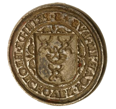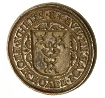 gegoten, gesneden, zilver diameter: 2.9 cm dikte: 0.2 cm hoogte: 2.5 cm gewicht: 24.2 gr Rond zegelstempel met aan de achterzijde een bewerkt handvat (halfrond filigrainwerk) en gegraveerd: S + PETRI + DE + BROECHOVE. Aan de voorzijde een omschrift met aan de buitenzijde een band van drie cirkels, en aan de binnenzijde een cirkel. Op een versierd veld een accoladeschild. Heraldische beschrijving: drie molenijzers, geplaatst 2-1; in het hart van het schild een jachthoorn. |
