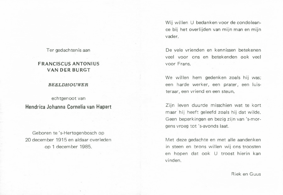 In 1952 vestigde Frans van der Burgt zich als vrij kunstenaar in Den Bosch. Hij verhuisde naar Rosmalen in 1959. In 1956 maakte hij een reliëf voor de Wilhelminabrug in Den Bosch met taferelen uit de stadsgeschiedenis. In de stationstunnel bracht hij een reliëf aan. Bij de ingang van de tunnel staat zijn beeld 'cultuur en arbeid'. In de trouwzaal van het Bossche stadhuis heeft hij acht deurpanelen en twee balkdecoraties gemaakt. Van der Burgt heeft acht gedenkpenningen ontworpen, onder meer voor het Internationaal Vocalistenconcours in Den Bosch en voor de Jeroen Bosch-tentoonstelling in 1967. In het gemeentehuis van Rosmalen staat de door hem gemaakte buste van koningin Beatrix. Ook het beeld voor gemeenschapshuis De Biechten in Hintham-Zuid is van zijn hand. Enkele maanden geleden werd voor het politiebureau in Rosmalen zijn beeld van de Rosmalense aannemers onthuld. |