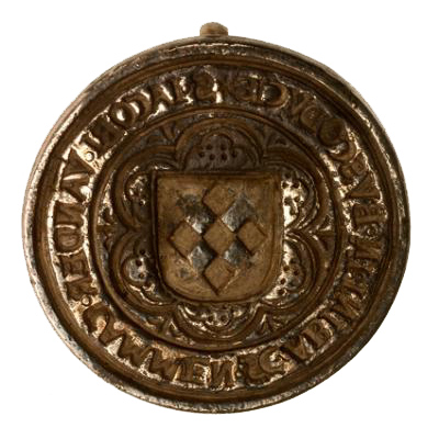 zilver, gegoten, gesneden diameter: 2.8 cm dikte: 0.2 cm hoogte: 1.9 cm gewicht: 20.3 gr Rond zegelstempel met aan de achterzijde een eenvoudig bewerkt handvat (voluutvormig met driepasvormige opening) en gegraveerd: IACOBI • VAND/ER • CAMMEN • 1 • 5 • 7 • 8 • . Aan de voorzijde een omschrift tussen twee banden van twee cirkels. Op een versierd veld omsluit een versierde zespas een half-cirkelvormig schild. Heraldische beschrijving: een zoom en vijf elkaar rakende ruiten, geplaatst 1-3-1. |