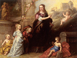 Op de schoorsteen prijken twee andere, kleine portretten, alsmede een schouwstuk van de Bossche kunstenaar Theodoor van Thulden. De laatstgenoemde vervaardigde ook de blikvanger van deze kamer: het omvangrijke portret van de nog jonge mevrouw Copes met vijf van haar kinderen (afb. 84).48 Het werd geschilderd omstreeks 1651, het jaar van aankoop van het huis De Munt, en was vermoedelijk van meet af aan bestemd voor het grote salet. Van Thulden beeldde de vrouw des huizes op allegorische wijze af in de gedaante van een Romeinse matrone, een scheepsroer in de hand: een toonbeeld van goede huishouding en bekommerd om de opvoeding van haar kinderen. Op het schilderij spoort zij haar kinderen aan het moeilijke pad van de Deugd te volgen en geen acht te slaan op Venus en haar verleidingen. Behalve de moeder zijn ook de vijf eerstgeboren kinderen afgebeeld. Van links naar rechts zien we de ongeveer twee jaar oude Agatha Elisabeth, de zes jaar oude Moralla Catharina, de vierjarige Hendrick en de pasgeboren zoon Willem. De kleine Aemilie, enkele jaren tevoren op tweejarige leeftijd overleden, werd rechtsboven weergegeven in de gedaante van een gevleugelde putto. Overigens zouden in 1653 en 1655 ook Agatha Elisabeth en Willem komen te overlijden.49 Achter het grote salet, aan de achterzijde van het huis, bevindt zich de slaapkamer van mr. Hendrick Copes, de oudste zoon. Het meubilair bestaat uit een ledikant met een groen stoffen behangsel en groen en wit beddengoed, twee eiken tafels - waarvan een met een rood tafelkleed -, vier met groen laken beklede stoelen, een eikenhouten kabinetje, een naaibank en een kapstok. De schouw is voorzien van een groen schouwkleed; daarboven hangt een portret. De boedelinventaris verschaft geen verdere informatie over de inrichting van deze kamer. We mogen aannemen dat de meeste voorwerpen in dit vertrek toebehoren aan de inmiddels 57 jaar oude Hendrick. Wel wordt melding gemaakt van een in een kinderkast bewaard sabel met schede en een met paarlemoer ingelegde wandelstok die hoogstwaarschijnlijk aan de overleden vader of aan een ander mannelijk familielid hebben toebehoord. Naast de slaapkamer bevindt zich een 'comptoir', waarin een houten tafel, een leren armstoel en een wit laddertje met zeven sporten.