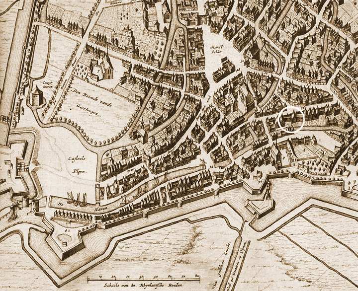 75) Plattegrond van 's-Hertogenbosch met het in de Postelstraat gelegen huis De Munt (omcirkeld). Joan Blaeu 1649 's-Hertogenbosch, Stadsarchief