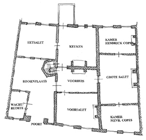 schragen, een eikenhouten kast, een grenen kastje en een 'schuijfflessenaer', alsmede kaarsen-, appelen geldlades. De laatste werden vermoedelijk gebruikt bij de belastinginning: zowel vader Copes als zoon Hendrick waren immers actief als ontvangers van de verpondingen in het omliggende gebied. Voorts vinden we in dit vertrek kamerschermen, lege manden en manden met oud glaswerk of 'prullen', bezemstelen, een deegtobbetje en ander overtollig keukengerei. Vermeldenswaard zijn nog de twee stilletjes, waarvan er een - heel comfortabel - blijkt te zijn bekleed met zwart leer, twee spinnewielen, twee mutsenbollen en twee pruikenbollen, 'twee munnicken om het bedde te warmen' (een soort met blik beslagen manden), twee oude musketten met een snaphaan, een draailier, een 'rompsteekbord' (een bord waarop het roemspel, een kaartspel, wordt gespeeld) en een kwartelkooi. Aan de muren hangen de onvermijdelijke kapstok en zes schilderijen en oude kaarten in de al even onvermijdelijke zwarte lijsten.