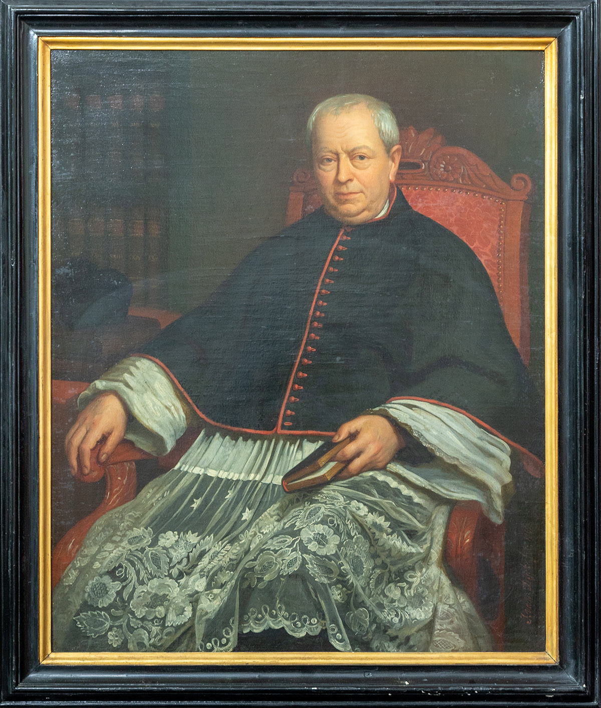 Corstens werd in 1820 te Mechelen tot priester gewijd. Hij was kapelaan van de Sint-Cathrienkerk in 's-Hertogenbosch van 1821 tot 1829. In dit laatste jaar ging zijn benoeming in tot pastoor van de St. Cathrienparochie. Op 4 april 1829 werd hij 'net als zijn voorzaat pastoor Wilh. Staessens door de minister van Binnenlandse Zaken benoemd tot R.C. geestelijke voor het Huis van reclusie en tuchtiging op een tractement van f. 400. Om reden dat ten gevolge van de Belgische opstand de criminele gevangenen meer naar het binnenland zijn getransporteerd geworden en dus de werkzaamheden zijn verminderd wordt het tractement vanaf 1 januari 1831 slechts met 2/3 uitbetaald en voldaan.' 1 In 1858 werd Corstens kanunnik van het kathedraal kapittel en in 1862 aan dat kapittel tot proost benoemd. In 1869 deed hij afstand van zijn pastoraat. Hij overleed te Sint Oedenrode op 13 oktober 1871. Hij is op 17 oktober 1871 begraven in Gemert. PortretHet portret is gesigneerd en gedateerd: 'J. van Dijck fec. 1862'De pastoor is gekleed als kanunnik, zittend in een met rode trijp beklede armstoel. In zijn linkerhand houdt hij een brevier. Links van hem bevinden zich een boekenkast en een tafel met bonnet en boeken. Kunstschilder Jac. van Dijck, geboren te Waalwijk op 10 september 1817 en overleden te Oisterwijk op 25 april 1896, was van 1834-1839 leerling van de Koninklijke school te 's-Hertogenbosch. Van 1847 tot 1853 was hij leerling van de Academie te Amsterdam. In 1869 werd hij tekenleraar aan de H.B.S. te Helmond en directeur van de Stads-tekenschool aldaar. In 1884 vestigde hij zich te Oisterwijk. Jacobus van Dijck signeerde en dateerde (J. van Dijck fecit 1861) eveneens een groot schilderstuk, olieverf op doek, getiteld 'Graflegging van Christus'. Het hangt in de Sint-Jan boven de Sint-Jozefkapel in de zuiderzijbeuk. Het meet circa 275 bij 201 cm. Christus wordt door twee mannen, Nicodemus en Joseph van Arimathea in het graf gelegd. Daarachter staan Maria en Johannes. Op de achtergrond is de Calvarieberg met kruisen te zien. Het schilderij was een ontwerp voor een kruiswegstatie in de St.-Janskathedraal in 's-Hertogenbosch, maar werd door het kerkbestuur niet geschikt geacht. Voor veertien van zulke grote schilderstukken was geen ruimte. |