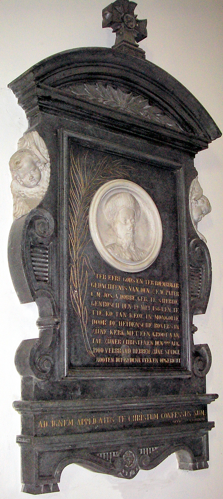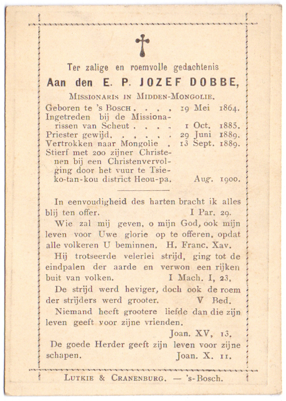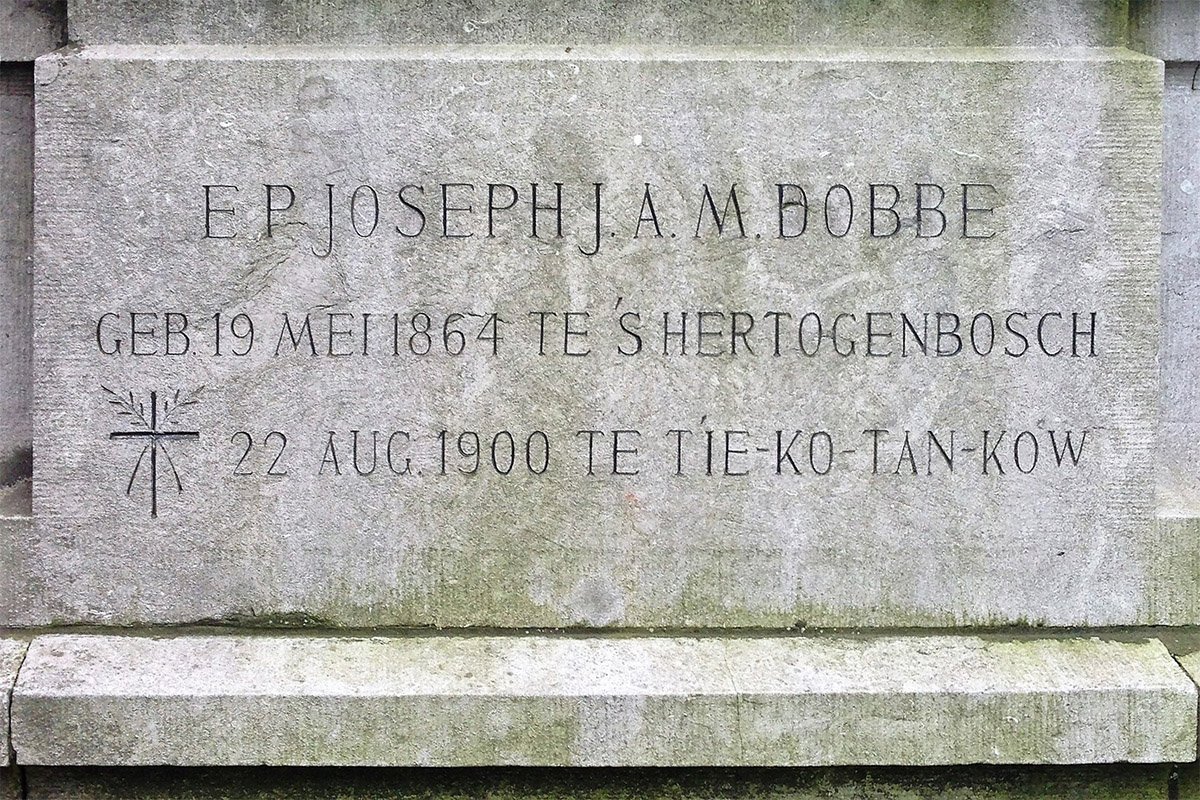 Cornelis Maria Josephus Alphonsus Dobbe (roepnaam Joseph) werd in ´s-Hertogenbosch geboren, op 19 mei 1864. De geboorte vond plaats in het woonhuis op het Ortheneind, wijk B, nummer 79. (Nu Orthenstraat nummer 12; het huis is al lang geleden gesloopt). Het perceel had een achteruitgang aan de Smalle Haven. De ouders, H.C. Dobbe en M.E.L.I. van Pelt, hadden een natuursteenhandel en leverden vooral marmeren winkelpuien en schoorsteenmantels. Het bedrijf, Dobbe/Van Pelt, werd vanuit de haven bevoorraad. In het Stadsarchief van ´s-Hertogenbosch heb ik de huwelijksakte van Josephs ouders gevonden: ´Op 11 september 1862 huwde Hugo Cornelis Dobbe, bouwmeester, jonge man dertig jaar oud, geboren te Sassenheim in Zuid-Holland op 26 januari 1832 en tot voor kort wonende in Veghel, maar nu alhier woonachtig, zoon van Cornelis Dobbe, meester timmerman en van Anna Cunera van der Velden, zonder beroep, beiden wonende in Sassenheim, en de andere zijde: Maria Emma Lisa Ida van Pelt, zonder beroep, jonge dochter, oud vier en twintig jaren, wonende en geboren alhier, geboren op 11 juli 1838, dochter van Thomas Wilhelmus van Pelt, alhier overleden op 19 juni 1861 en van Maria Theresia Verbeke zonder beroep alhier´. Joseph Dobbe, zoon uit dit huwelijk, groeide op in Den Bosch, studeerde vervolgens in Sittard en later op het seminarie Beekvliet in Sint Michielsgestel. Hij trad in bij de Congregatie van het Onbevlekt Hart van Maria (CICM). Deze Congregatie was in 1862 gesticht door de Vlaamse priester Theophile Verbist (1823-1868) in Scheut/Scheutveld, een wijk in Anderlecht in het gewest Brussel, en de paters van deze congregatie worden dan ook kortweg Scheutisten of missionarissen van Scheut genoemd. Ze wilden missioneren in andere werelddelen. Vanaf 1865 was China het eerste zendingsgebied. De stichter Verbist was in dat jaar al met enkele andere missionarissen naar Binnen-Mongolië vertrokken. Ze reisden via het nieuwe Suezkanaal en Hongkong naar Shanghai en vandaar naar een klein dorpje in Binnen-Mongolië, een Chinese provincie, honderden kilometers ten noord-noord-westen van Peking, een hoog gelegen, zeer onherbergzaam gebied met verspreid liggende versterkte dorpjes, waar ze de plaats van Franse Lazaristen innamen. Niet alleen bleek de taal moeilijk, maar ook het barre klimaat, het voedsel, de nodige kleding, kortom de hele cultuur vergde veel van hun aanpassingsvermogen. Verbist stierf in 1868 aan vlektyfus. In deze missiecongregatie werd Joseph Dobbe op 29 juni 1889 tot priester gewijd en na enkele maanden vertrok hij al naar het Mongoolse missiegebied. Vanuit Brussel, op 22 september, eerst per trein naar Marseille, samen met elf collega´s. Met als enige bagage een regenscherm, reisdeken en brevier. Op 30 september gingen ze aan boord van het Franse stoomschip ´Océanien´ voor een reis van 39 dagen via het Suezkanaal en de Indische Oceaan naar Shanghai. Daar stapten ze over op een kustvaarder en voeren naar de Golf van Bohai. In een havenstad werd de trein naar Peking genomen en van daaruit volgde een lange reis te paard, via Si-Wan-Tze (Chong-li) naar de eindbestemming Tíe-Ko-Tan-Keou. Al na tien jaren begon de opstand van de zg. ´Boksers´. De westerse benaming ´Boksers´ komt voort uit het parool van deze opstandelingen: ´Vuisten verenigd voor de gerechtigheid´. Zij vochten ook op traditionele manier met stokken en lange messen. De opstand van de Boksers werd aangewakkerd door een vreselijke hongersnood. De nationalistische opstandelingen streefden naar de verdrijving van de kolonialisten met hun stoomboten, telegraafpalen, spoorwegen en kerken. Ze keerden zich fel tegen de Westerse invloeden van de Christelijke religieuzen: de landbouwontwikkeling werd ter hand genomen met de hulp van irrigatietechnieken, het onderwijs werd bevorderd, klinieken werden gebouwd voor de zorg aan zieken, epidemieën werden bestreden, wetenschappelijk onderzoek naar taal en cultuur kwam van de grond, kleine Christelijke gemeenschappen werden gevormd, maar dit alles paste niet in het wereldbeeld van de Boksers. De Christenen moesten het hierbij vooral ontgelden en die hadden al felle tegenstand van mohammedanen in Mongolië. (Een goed beeld van de onzekere politieke omstandigheden en de moeilijkheden in het levensonderhoud in Binnen-Mongolië in die jaren wordt treffend beschreven in de correspondentie van de uit de Belgische plaats Opwijk afkomstige pater Désiré Abbeloos met zijn oversten in Scheut en met de familie in Opwijk). Tijdens de opstand van 1899-1900, kwam een geallieerd expeditieleger van 50.000 soldaten wel Pekings diplomatenwijk beschermen, maar op het uitgestrekte platteland kwamen duizenden Chinese Christenen om het leven. Ook westerse missionarissen, waaronder de Nijmeegse bisschop Ferdinand Hamer (1840-1900), en andere Scheutisten lieten het leven. Op 22 augustus 1900 vond pater Dobbe de dood toen zijn kerk in brand werd gestoken, waarheen hij met 300 parochianen en zendelingen met hun gezinnen was gevlucht. Pas in november van dat jaar werd zijn dood in ´s-Hertogenbosch bekend. De dood van de Scheutisten in het verre China schokte de Katholieke Nederlanders en was de aanleiding tot het oprichten van gedenktekens. Ter nagedachtenis aan Bisschop Hamer werd in 1903 een standbeeld opgericht in Nijmegen en op de sokkel daarvan zijn de bronzen portretten van de Scheutisten Joseph Dobbe uit Den Bosch, Gijsbertus Jaspers uit Geldrop en Andreas Zijlmans uit Waalwijk aangebracht. In de parochiekerk van Joseph Dobbe, de Sint Pieter in ´s-Hertogenbosch, werd in 1903 het zg. Dobbe-monument tegen de wand geplaatst. Daarnaast hing de volgende oorkonde: