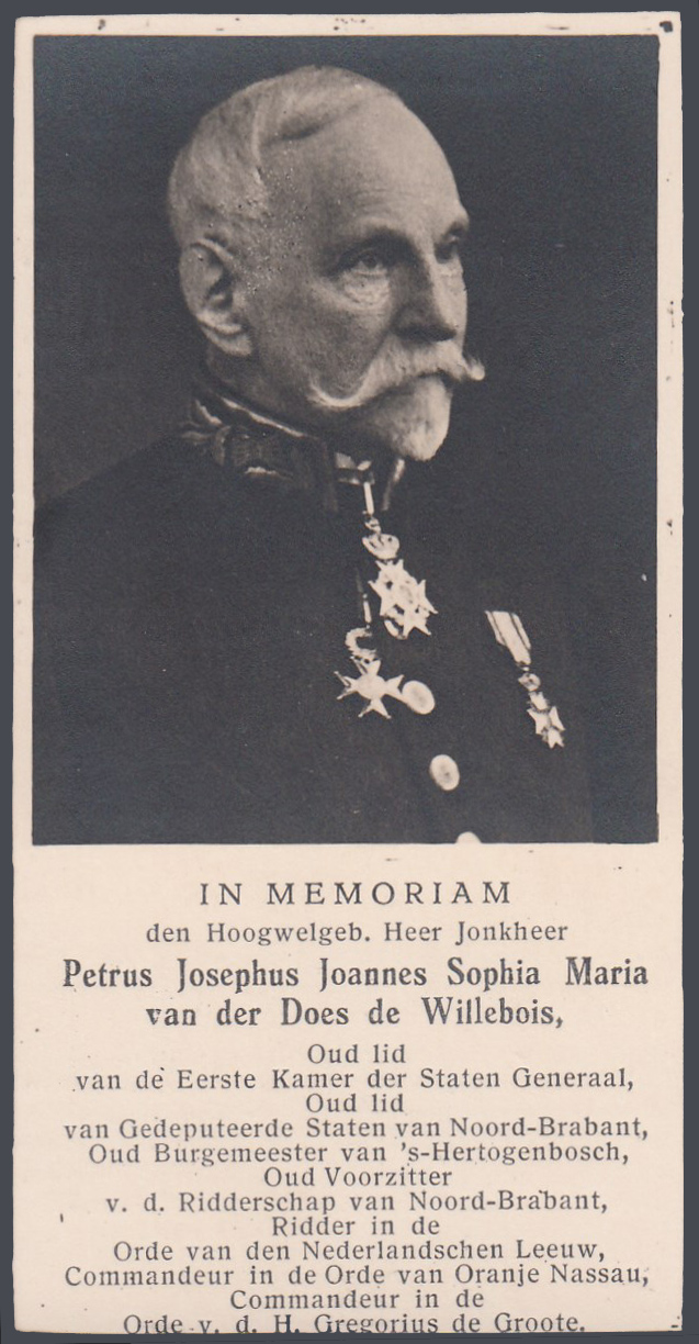 's-Hertogenbosch 9 januari 1843 - aldaar 11 mei 1937Gedeputeerde-statenlid en burgemeester 's-Hertogenbosch. Huwde aldaar 1878 Jkvr. Maria Henriëtta Elisabeth Bosch van Drakenstein ('s-Hertogenbosch 30 mei 1857 - aldaar 26 maart 1919) (dochter van Jhr. Mr. Paulus Jan en Elisabeth Henriëtte Johanna Bosch). In (pj) 1875 Gedeputeerde-statenlid. In (pj) 1895 burgemeester 's-Hertogenbosch, Provinciale-statenlid, bestuurslid Provinciaal Genootschap voor Kunsten en Wetenschappen. In (pj) 1910 burgemeester, Eerste-kamerlid, buitengewoonlid centrale gezondheidsraad, bestuurlid Provinciaal Genootschap voor Kunsten en Wetenschappen. In 1873/74 werd ten behoeve van de hoofdelijke omslag te 's-Hertogenbosch het inkomen geschat op ƒ 2200,-, zonder toevoegingen. In (pj) 1895 en 1910 vermeld op lijst van hoogstaangeslagenen met onbekende aanslag. Ten behoeve van de plaatselijke inkomensbelasting 1894 te 's-Hertogenbosch werd het inkomen geschat op ƒ 15.000,-. | 366 |