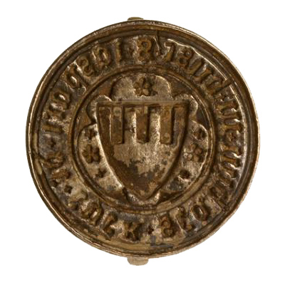 zilver, gegoten, gesneden diameter: 2.6 cm dikte: 0.1 cm hoogte: 1.7 cm gewicht: 8.7 gr Rond zegelstempel met aan de achterzijde een eenvoudig bewerkt handvat (voluutvormig met 'visblaas'-achtige opening) en gegraveerd: S • IASPARI • DE • EIJCK. Aan de voorzijde een omschrift tussen twee banden van twee cirkels. In een met drie vijfbladige bloempjes en vier vierbladige bloempjes versierde zespas een vroeg-gotisch schild. Heraldische beschrijving: drie geknotte palen. |