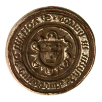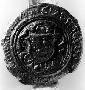 zilver, gegoten, gesneden diameter: 2.6 cm dikte: 0.2 cm hoogte: 1.8 cm gewicht: 11.8 gr Rond zegelstempel met aan de achterzijde een bewerkt handvat en in gotisch schrift: adrian@ de eijndhouts (@ een afkortingsteken). Aan de voorzijde een omschrift tussen twee banden van twee cirkels. In een versierd veld omsluit een twaalfpas met afwisselend rechte en ronde hoeken een accoladeschild. Heraldische beschrijving: drie eenden, geplaatst 2-1. |