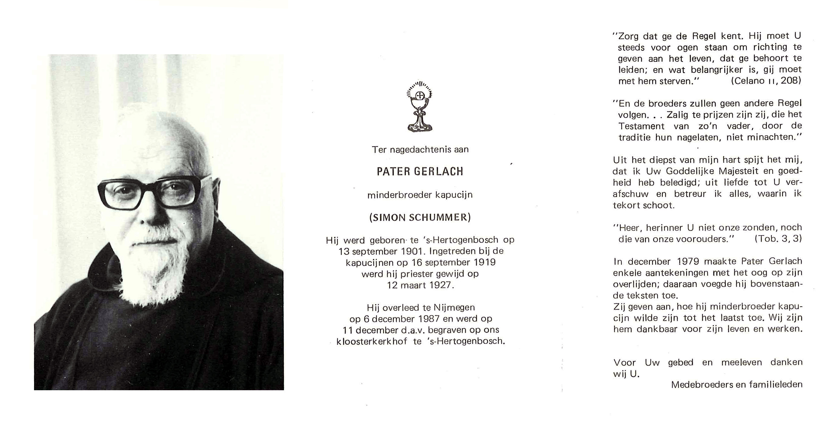 Gerlach, of Cap. Pater FM, kloosternaam van Simon Schummer; volgde gymn. seminarie der Capucijnen te Langeweg; philosophie en theologie te Udenhout, Helmond, 's-Hertogenbosch, historische wetenschappen aan de Univ. Leuven, kunstgesch. en chr. archeologie; werd hoofdredacteur van Franciscaans Leven. tijdschift van de Franciscaanse ascese, geschiedenis en kunst; lector aan het theologicum der Capucijnen in kerkgesch. en patrologie; docent aan de r.k. Leergangen cultuurgesch. en ikonografie; archivaris Ned. Prov. der Capucijnen; lid bestuur Bisschoppelijk Museum; specialiseerde zich sedert 1966 in de schilder Hieronymus Bosch; publ. talloze artikelen; kreeg de Jeroen Boschpenning van Den Bosch in zilver. Kunsthist. documentatie, vooral over Jeroen Bosch, is of wordt overgedragen aan Kunsthist. Inst. Univers. Nijmegen en aan Bibl. Prov. Genootschap. | 44 |