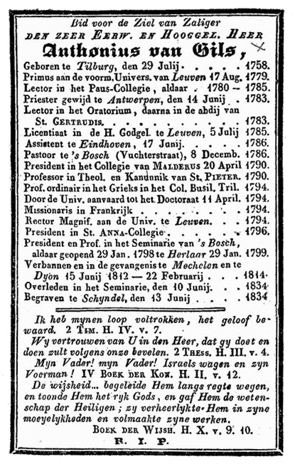 Begraven te Schijndel; lagere studie aan het College in Turnhout; stud. Universiteit van Leuven. Behaalde de eerste plaats licentiaat in de wijsbegeerte, in 1785 licentiaat in de Godgeleerdheid, werd vereerd met de doctorale hoed; weigerde het aanbod van keizer Jozef II om een leerstoe in zijn seminarie-generaal te bekleden; ging terug naar het Bossche vicariaat, stichtte klein seminarie Veebeek in Berlicum, kocht het landgoed Beekvliet aan voor het klein-seminarie, was mede-stichter van het groot-seminarie Nieuw-Herlaer te Sint-Michielsgestel en daarvan de eerste president. Publicatie: De Ephemerides (dagboek 1806-1812). Overleed op kasteel Herlaer. | 68 |