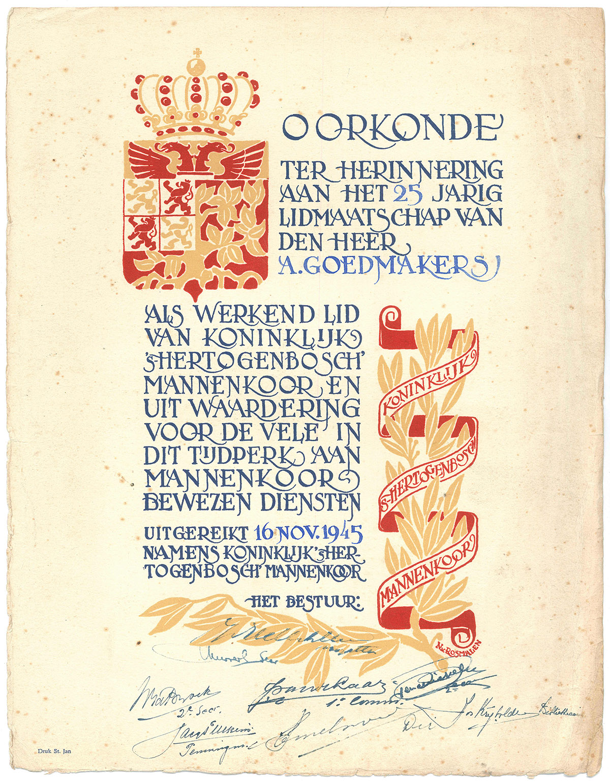 DEN BOSCH, zaterdag (ANP) - De burgemeester van Den Bosch, mr. H. Loeff, heeft gisteravond in zijn functie van ere-voorzitter van het Koninklijk 's Hertogenbosch Mannenkoor, aan notaris J. van Hellenberg-Hubar, voor zijn vele verdiensten voor het culturele leven van de Brabantse hoofstad, de Jeroen Bosch-penning in zilver uitgereikt. Dit geschiedde op en ereavond van het koor, waaraan de heer A. Goedmakers de Jeroen Bosch-penning in brons werd uitgereikt.