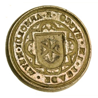 zilver, gegoten, gesneden diameter: 2.7 cm dikte: 0.3 cm hoogte: 2.4 cm gewicht: 23.6 gr Rond zegelstempel met aan de achterzijde een bewerkt handvat (halfrond filigrainwerk) en gegraveerd: AERT • HEYM GYS^B. Aan de voorzijde een omschrift met aan de buitenzijde een band van twee cirkels, en aan de binnenzijde een cirkel. Een versierde vierpas, doorsneden door een vierkant, raakt de binnenste cirkel en omsluit een half-cirkelvormig schild. Heraldische beschrijving: een zoom en een zespuntige ster. |