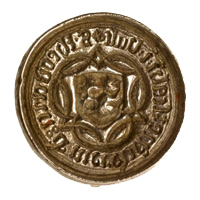 zilver, gegoten, gesneden diameter: 2.6 cm dikte: 0.2 cm hoogte: 2.2 cm gewicht: 12.2 gr Rond zegelstempel met aan de achterzijde een eenvoudig bewerkt handvat (voluutvormig met 'visblaas'-achtige opening) en in gotisch schrift: dirck vâde mevêne. Aan de voorzijde een omschrift met aan de buitenzijde een band van drie cirkels. Een driepas, doorsneden door een concave zespas, omsluit een vroeg-gotisch schild. Heraldische beschrijving: een omgewende meermin. |