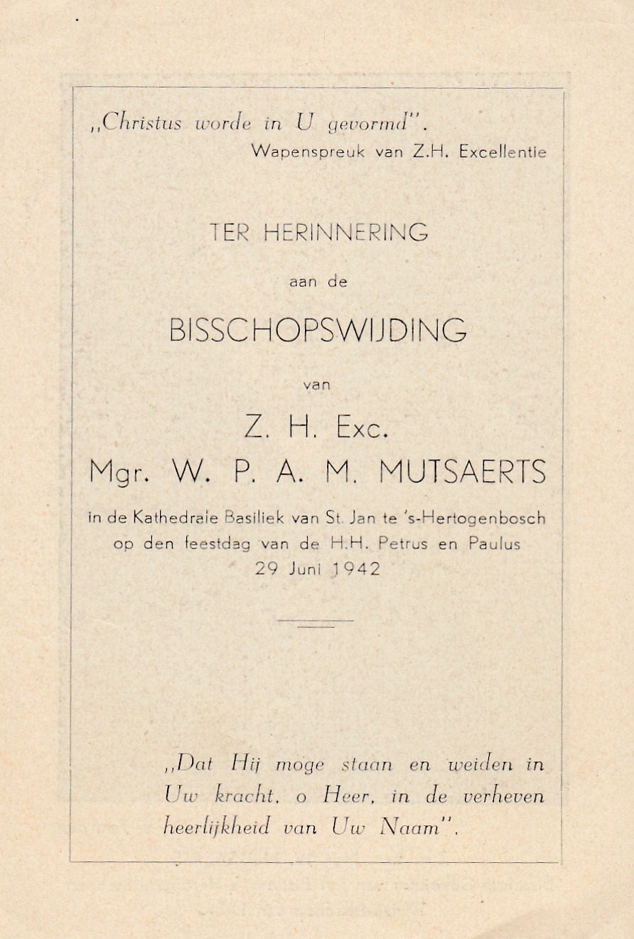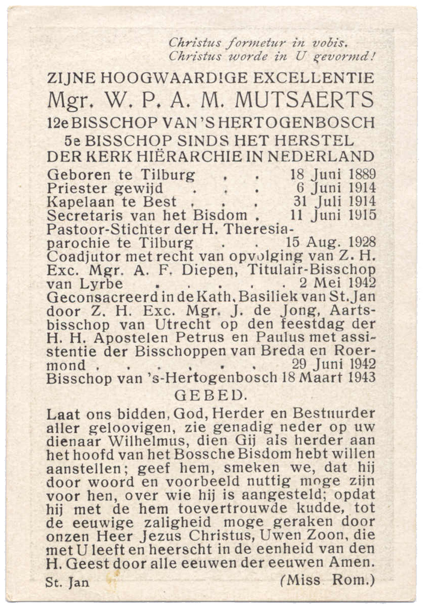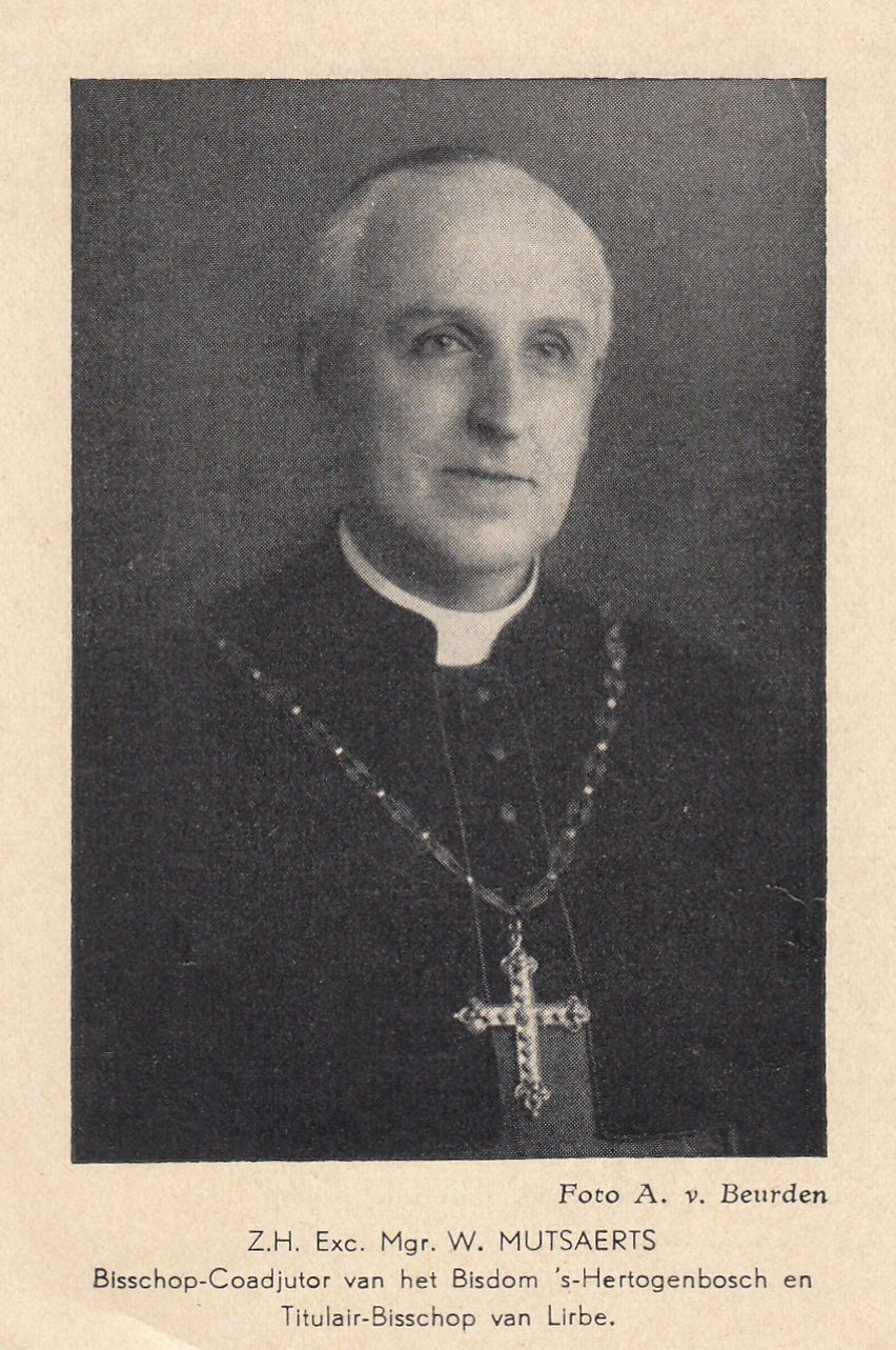 Werd in 1942 bisschop gewijd in de St. Jan. Mutsaerts was van 1925-28 secretaris van het bisdom en vervolgens bouwpastoor van de H. Theresiaparochie te Tilburg. In mei 1942 werd hij benoemd tot coadjutor van mgr. A.F. Diepen en titulair bisschop van Lyrbe. Door de ziekte van mgr. Diepen voerde hij in feite reeds vanaf het begin het bestuur van het bisdom. Na diens dood werd hij residerend bisschop. Zijn wapenspreuk was Christus Formetur In Vobis (Christus worde in u gevormd). Mgr. Mutsaerts trad af in 1960. Tot aan zijn dood in 1964 voerde hij de titel van aartsbisschop van Fulli. Hij werd opgevolgd door zijn coadjutor mgr. W. Bekkers. Mgr. Mutaerts was ridder in de Orde van de Nederlandse Leeuw en groot-officier in de orde van Oranje-Nassau. | 136 |