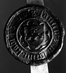 zilver, gegoten, gesneden diameter: 2.7 cm dikte: 0.1 cm hoogte: 1.7 cm gewicht: 11.1 gr Rond zegelstempel met aan de achterzijde een eenvoudig bewerkt handvat (voluutvormig met 'visblaas'-achtige opening) en in gotisch schrift: laûrêtij pelgrî. Aan de voorzijde een omschrift met aan de buitenzijde een band van drie cirkels, en aan de binnenzijde een cirkel. In een met vijf vierbladige bloempjes versierde zespas een vroeg-gotisch schild. Heraldische beschrijving: een zoom en een beurtelings gekanteelde dwarsbalk; boven een bij. |