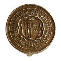 zilver, gegoten, gesneden diameter: 2.4 cm dikte: 0.3 cm hoogte: 1.7 cm gewicht: 16.6 gr Rond zegelstempel met aan de achterzijde een eenvoudig bewerkt handvat (voluutvormig met driepasvormige opening) en in gotisch schrift: mester raes. Aan de voorzijde een omschrift met aan de buitenzijde een band van drie cirkels, en aan de binnenzijde een cirkel. Op een versierd veld omsluit een zespas een half-cirkelvormig schild. Heraldische beschrijving: gedeeld; in I. een beurtelings gekanteelde dwarsbalk, en II. doorsneden, met in a. een klimmende leeuw, en b. gepaald van drie palen van vair. |