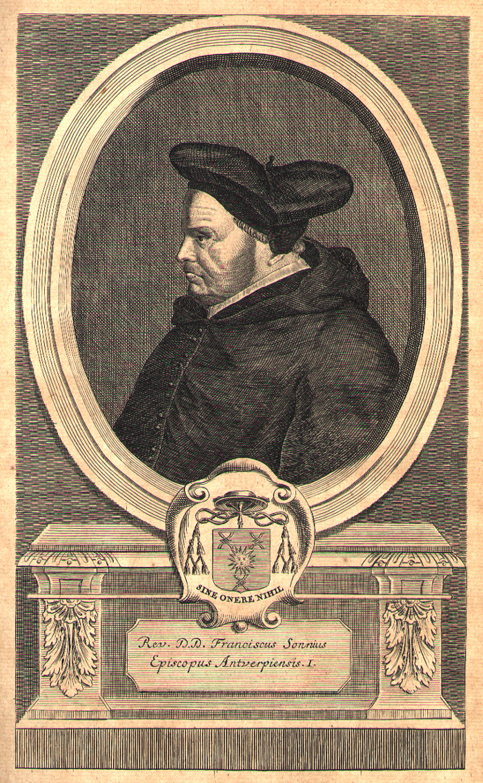 werd hij eerste bisschop van 's-Hertogenbosch, maar werd daar door burgerij en geestelijkheid niet enthousiast ontvangen. In 1566 na de beeldenstorm moest Sonnius de wijk nemen. In 1569 dook hij op in Leuven, maar kreeg van landvoogdes Margaretha van Parma opdracht naar Den Bosch terug te keren. Eerst in 1568, toen Alva in de stad was, kon Sonnius er zijn gezag vestigen. In 1570 werd hij bisschop van Antwerpen, waar hij zijn ideeën ook met behulp van Alva doorzette. In 1576, machteloos door geldgebrek en wantrouwen, stierf hij. Zijn wapen droeg de afkorting S.O.N.: Sine Onere Nihil, niets zonder moeite. Maar zijn leven stond in het teken dat ook met veel moeite soms maar weinig wordt bereikt. | 83 |