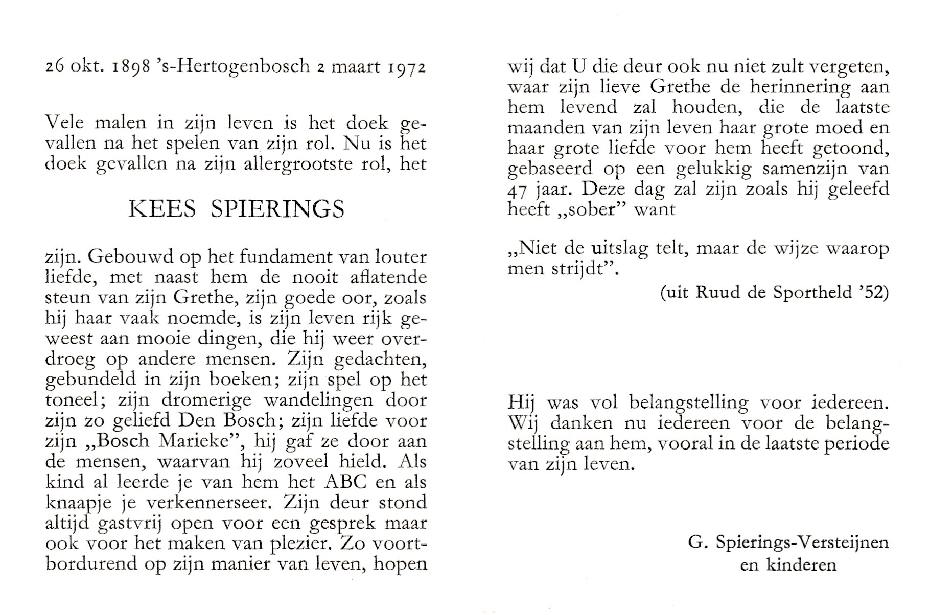 bron: Brabands Dagblad 25 oktober 1968.Auteur, regisseur; was ruim vijfentwintig jaar onderwijzer van de St. Leonardusschool in Den Bosch en schreef jongensboeken: De zesde klas van mijnheer Fransen, De ster van Blauw Wit, De Uruguees, Zigeuners bedreigen ons Kamp en Het geheim van de drie Dassen. Uit die tijd dateren ook zijn contacten met het toneel, voornamelijk met het 'Roomsch Toneel' waarvan hij later voorzitter werd. Hij volgde Herman Moerkerk op als regisseur o.a. in 'De gehangene met den koorde' van Henri Ghéon, wiens werk hij ook vertaalde. Rond 1930 schreef hij voor het gezelschap van Frits Bouwmeester zijn eerste stuk, 'De Lichte Last' geheten; samen met Cor Hermus bewerkte hij Antoon Coolens boeken voor toneel: Kinderen van ons Volk en De schone Voleinding. Voor zijn derde stuk, 'Een huis vol list en liefde', kreeg hij van 'Ons Lekenspel' in 1939 de hoofdprijs, terwijl ditzelfde stuk door de studenten van Nijmegen opgevoerd werd onder de titel 'Carnaval de Venice'. In datzelfde jaar bracht de Utrechtse studentenvereniging Veritas 'Jan Alleman Roept' ten tonele.Ter gelegenheid van het bezoek van de koningin in 1948 aan Den Bosch regisseerde hij het spel 'Brabantia'. Als auteur is Spierings ook bekend van zijn boeken: De beste wever van Tilburg, Kruisende Wegen en Een vreemde eend in de bijt. In 1954 kreeg hij de medaille van het Prins Bernhardfonds, in 1958 de 'Provincieprijs voor Schone Kunsten' in de afdeling Toneel, de Eduard Verkadepenning in 1963 (als eerste), in 1964 de Jeroen Bosch-penning in zilver van de stad Den Bosch. Na afscheid als regisseur hield hij zich bezig met het vertalen van werk en het verzorgen van een rubriek betreffende oude ansichten in het Brabants Dagblad, die ook in boekvorm is verschenen. | 88 |