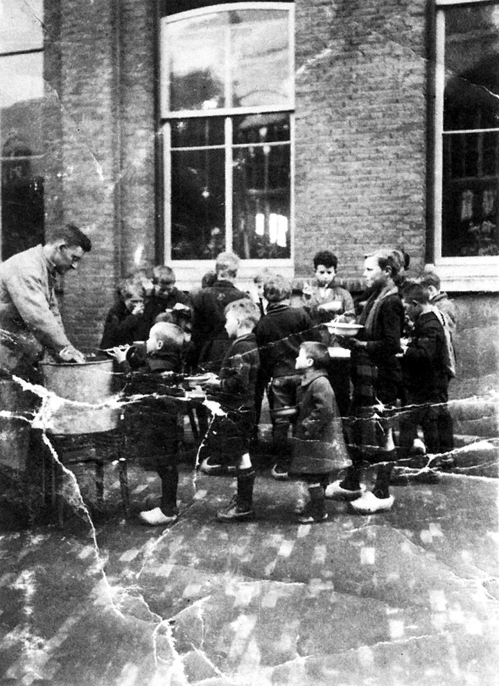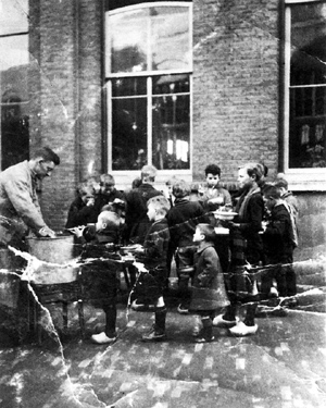 ![body=[]](img/vossen, frans (02).jpg) In de middag kreeg de schooljeugd warm eten. Het werd klaargemaakt in de gaarkeukens van Vincentius aan de Hoge Nieuwstraat en rondgebracht in ketels. De speelplaats van de Cathrienschool omstreeks 1910. Links frater Rodulphus en rechtsachter, met donkere krullenbol, Frans Vossen, rechts naast hem Jan Meijer.