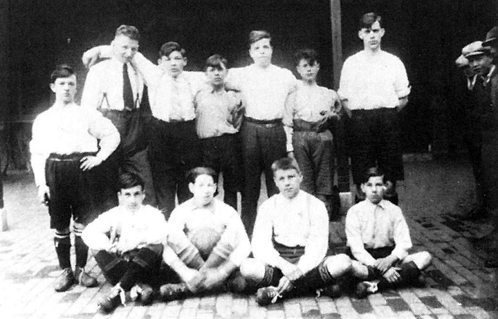 ![body=[]](img/vossen, frans (03).org.jpg) Op de foto de voetbalclub van het jongenspatronaat van de St. Cahtrien omstreeks 1920. Links Henk Vossen, derde van links bovenaan Berends van de IJsbeer aan de Graafseweg, dan Piet Vossen, Van de Broek, Kees van Alphen en Rien van Herpen. Onderaan Van de Wijngaarden, Schuurmans, Kivits (trombonist van de Kikvorschen) en Albert Kwaks.