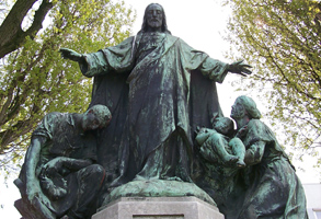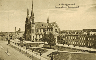 In het uitbreidinggebied ten westen van de Dommel dat aan het eind van de negentiende eeuw werd gerealiseerd - De Werken genoemd en later Het Zand - was een riant plein ontworpen. Dit plein kreeg in 1897 van de Bossche gemeenteraad een naam: Emmaplein, genoemd naar Adelheid Emma Wilhelmina Theresia, koningin de Nederlanden (1858-1934) die gehuwd was met koning Willem III. Zij was regentes (1890-1898) voor haar dochter, de latere koningin Wilhelmina. Ten zuiden van dit plein lag de Korte Havenstraat. Dwars hierop bevond zich nog een straat: de Grobbendonckstraat. Deze was in 1898 genoemd naar Anthonie Schets, baron van Grobbendonck, de militaire bevelhebber van 's-Hertogenbosch die in 1629 tegen de troepen van Frederik Hendrik streed. In deze Grobbendonckstraat stond ondermeer het Evangelisatiegebouw Bethel. En verder waren er woonhuizen in deze nieuwe Bossche stadswijk. Oktober 1944 heeft ook hier duidelijk de sporen nagelaten. het oorlogsgeweld verwoestte vele panden. In de Grobbendonckstraat zelfs zoveel, dat in het na de Tweede Wereldoorlog tot stand gekomen nieuwe stratenplan deze straat zelfs geheel verdwenen is. Opmerkelijk genoeg had het gebouw Bethel de oorlogsverwoestingen overleefd en werd nu verbonden met een nieuw kerkgebouw aan het Emmaplein. Dit kerkgebouw werd gebruikt door de Gereformeerde Kerk en later door de Nederland Hervormd Evangelische Gemeente. Vele andere panden aan het Emmaplein - waaronder het grote scholencomplex - werden in de vijftiger jaren herbouwd. Het Emmaplein, een groen oase van rust in de wijk, kreeg nog voor de Tweede Wereldoorlog een H. Hartmonument. Eertijds was dit geplaatst op het Julianaplein, maar het toenemende autoverkeer zorgde ervoor dat er elders ruimte voor gezocht diende te worden. Dat werd dus het Emmaplein. Tijdens het 'rijke Roomse leven' werd tenminste eenmaal per jaar het Emmaplein druk bezocht door een grote processie die vanuit de Leonarduskerk naar dit monument trok. Bruidjes, bloemen, wierook: dit alles was er ruim voldoende mate aanwezig. Maar vele kerkelijke processies verdwenen, de Leonarduskerk werd zelf afgebroken en ook het H. Hartmonument raakte in verval. Het is drukker geworden rond het Emmaplein. Geparkeerde auto's zijn er duidelijk aanwezig. Kantoren in de vele panden rondom het plantsoentje. Hoewel plantsoen? Het werd in ieder geval anders ingedeeld en beplant. Slechts bomen en gras zijn er nu te vinden. En het H. Hartmonument is duidelijk aan restauratie toe. De Grobbendonckstraat is verdwenen, maar in de zeventiger jaren werd er dwars door het prins Hendrikpark een grote weg aangelegd die naar deze Bosschenaar van bijna vier eeuwen geleden genoemd werd: de |