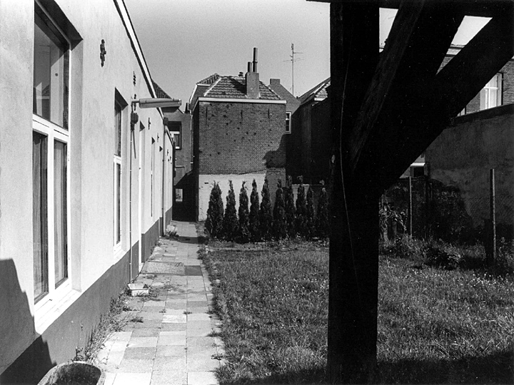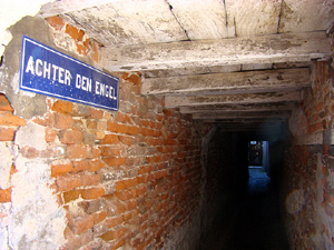 Het steegje 'Achter den Engel' bevindt zich tussen Vughterstraat 201 en 203 én tussen Westwal 26 en 27. Het is genoemd naar het hoekhuis 'De Engel', Vughterstraat 201. Het huis op nummer 203 dateert uit 1635 en heette 'Sinte Anna'; later werd het 'De Asbak'. Vanuit de Vughterstraat is het eerste gedeelte van 'Achter den Engel' een lage doorgang van nauwelijks 170 cm hoog. Balken die een houten vloer dragen, zijn in het zicht. De onderdoorgang is opgenomen in de gevel van het huis dat boven de doorgang is gebouwd. Het behoort tot het middeleeuwse stratenpatroon. Eeuwen lang was de Vughterstraat met de Westwal verbonden via 'het Engeltje', zoals het steegje meestal genoemd werd. Tegenwoordig is een vrije passage niet meer mogelijk. Na enkele tientallen meters vanaf de Vughterstraat verhindert een houten poort een verdere doortocht. Aan de zijde van de Westwal is een toog in de gevel aangebracht. De eerste vijf meters zijn hier overbouwd, daarna loop je tegen een ijzeren spijlenhek aan. De bovenkant van het hekwerk is versierd met een halve cirkel plaatwerk, waarin een engel met bazuin is uitgesneden. Het middengedeelte van 'Achter den Engel' is geblokkeerd vanwege een binnentuin met poorten. Een directe verbinding tussen Vughterstraat en Westwal is nog via het Katerstraatje en Achter de Bogaard mogelijk. Aan de kant van de Westwal bevindt zich bij de ingang van het steegje een rondeel in de vestingmuur. Van hieruit heeft men naar weerskanten een vrij zicht op de vestingmuur en de Stadsdommel. |