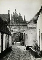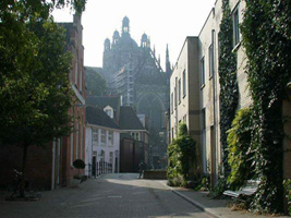 Het toeristenseizoen is weer geopend in Den Bosch en de meimaand van Maria staat voor de deur. Redenen voor velen om naar de hoofdstad van Noord-Brabant te trekken voor een toeristisch bezoek of pelgrimage. De Sint-Janskathedraal behoort niet tot de 'verdwenen stadsbeelden', maar toch is het aanzicht van deze gotische kerk de laatste eeuw totaal anders geworden. De kerk is gerestaureerd en in het begin van de eeuw kregen de koepeltjes op de midden toren een ander aanzicht en ook de wijzerplaten in de westtoren kregen een heel andere plaats. Wat wel degelijk veranderd is, is het aanzicht op de middeleeuwse kerk. Tot voor honderd jaar was de kerk letterlijk hét hoogtepunt van de stad met zijn markante bouw die uittorend boven de andere huizen en gebouwen van de stad. Daaraan is deze eeuw nogal wat veranderd: vele andere hoge gebouwen zorgden dat de Sint-Jan zich niet meer markant verheft boven de andere panden. Weliswaar is het provinciehuis niet in de binnenstad gebouwd, maar plannen lagen daar wél voor klaar. Zelfs vanuit Het Bossche Broek is het Bossche aangezicht aangetast: de flat aan het Loeffplein, de toneeltoren van het Casino en de hoge zuil bij de PTT tasten het Bossche prospect in ernstige mate aan. Eveneens vanuit de Bossche binnenstad zelf is het zicht op de kerk verstoord. Door de komst van hogere gebouwen in de binnenstad zijn verassende doorkijkjes verdwenen of geheel veranderd. Maar gelukkig vertoont de kathedraal zich toch nog regelmatig en ook spontaan aan Bosschenaren, toeristen, pelgrims en passanten. Bijvoorbeeld vanuit In den Boerenmouw. In dit straatje bevond zich van vlak na 1629 tot 1803 een schuilkerk, omdat de katholieken geen andere manier hadden om naar de kerk te gaan. Later werd er het pand de Sociëteit Concordia gevestigd en nog later - na een verbouwing - hadden de paters Redemptoristen er een tehuis voor R.K. Militairen. Achterin In den Boerenmouw bevond zich een poortgebouw met een hofje erbij. Het waren kleine, wit gekalkte huisjes en daar groeiden zelfs druiven. Dat was toen - enkele tientallen jaren geleden - een unicum in Den Bosch: niemand anders had zo'n plant in de tuin. Maar echt opmerkelijk was dat niet, want in de middeleeuwen strekten de Brabantse wijnranken zich uit tot de hoofstad van de Meierij. Maar ook dit karakteristieke hofje is verdwenen, slachtoffer van de slopershamer. Ervoor in de plaats kwamen moderne huizen, een parkeergarage en en buurtparkje: de Jeroen Boschtuin. Gebleven is de Binnendieze die onder de straat door stroomt. Toeristen en kunstenaars hadden het kleine straatje al lang ontdekt: van hieruit heb je een fraai uitzicht op het noorderportaal van de Sint-Janskathedraal, maar ook in de toekomst zullen lenzen van fototoestellen en videoapparaten weer vanuit In den Boerenmouw gericht worden op deze gotische kerk. |