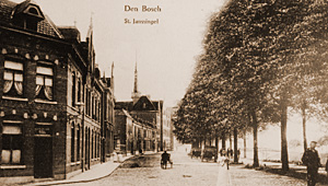 Een kleine honderd jaar geleden onderging de St. Janssingel een forse gedaantewisseling. Ongeveer hetzelfde uiterlijk heeft deze singel thans nog. Na de Vestingwet van 1874 kon er op de voormalige vestinggronden gebouwd worden. 's-Hertogenbosch was haar positie als vestingstad kwijtgeraakt en de wallen en stadspoorten konden geslecht worden. De aan het eind van de St. Jansstraat staande stadspoort verdween onder de slopershamer. De aarden wallen boven de stadsmuren bleven staan. Enkel aan de St. Janssingel was dat niet het geval: de muren werden gesloopt en vervangen door brede taluds. En, als overal op de voormalige vestinggronden, er werden bomen geplant. Voor het eerst werd er aan de St. Janssingel gebouwd. Overal ziet men dan juist arbeiderswoningen aan de rand van de stad verschijnen. Want vooral onder de arbeidende klasse in de voormalige vestingstad was de woningnood groot. Voor hen werden hier 'riante' (zeker voor die tijd) woningen gerealiseerd. Aan de St. Janssingel kwam ook een klooster, Mariënburg. Dit klooster van de Zusters van JMJ (Jezus, Maria en Jozef) had de naam van een hier in vroeger eeuwen gestaan hebbend klooster overgenomen. De St. Jansstraat was de eerste straat die men passeerde nam de stad via de St. Janspoort te zijn binnengekomen. In het latijn stond hier een spreuk op: 'Bescherm, door God geliefde patroon Johannes, deze poort, uw burgers, haardsteden en altaren.' Hier in deze straat waren altijd al herbergen gevestigd geweest. Vóór men aan een reis begon, af als men terugkeerde, was hier de gelegenheid iets te drinken. Ook thans bevinden zich hier nog horecagelegenheden: een Mexicaans restaurant en een dansschool. de naam St. Jansstraat is al honderden jaren oud en zij is ontleend aan de ruim een eeuw geleden verdwenen stadspoort. De naam Sint Janssingel werd eerst precies honderd jaar geleden, in 1897, aan de nieuwe straat gegeven. De foto dateert uit ongeveer 1925. Duidelijk is te zien dat deze straat op het eind van de vorige eeuw ruim is aangelegd: er is ruim voldoende gelegenheid om rustig over straat te wandelen. Het toenemende verkeer is dé grote verandering in het Bossche straatbeeld van de laatste honderd jaar! |