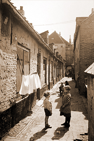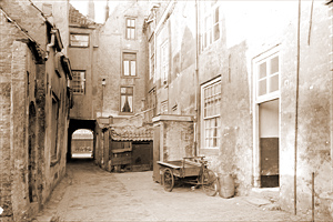 Het naar de zeventiende eeuwse notaris Pieter de Louw genoemde straatje heeft de laatste halve eeuw drastische veranderingen ondergaan: op een enkel pand na is het onherkenbaar geworden. Als je foto's uit het begin van deze eeuw ziet, merk je meestal lege straten op met enkele mensen die nieuwsgierig naar de fotograaf en zijn toestel staren. Veel straten zijn 'leeg' gefotografeerd: het stadsbeeld stond voorop. Later zou dit veranderen en kregen leuke tafereeltjes ook de aandacht van de fotograaf. Zo bijvoorbeeld deze scene in de Louwschepoort. Aan het eind van de jaren dertig reeds ontwikkelden Bossche stadbestuurders plannen om binnenstadsbuurten te saneren en in het stadscentrum pleinen en forse straten aan te leggen. Het Minderbroedersplein, Burg. Loeffplein en een plein bij Lombardje werden toen reeds ontwikkeld, realisering van de plannen volgde ruim twintig jaar later. Ook voor wat betreft doorbraken door de stad om het steeds groeiend autoverkeer dichter bij het stadshart te laten komen, werden ruim een halve eeuw geleden reeds plannen ontworpen. Zo zou de Clarastraat verbreed moeten worden tot de breedte van de Papenhulst. En zou dezelfde weg door moeten lopen aan de andere zijde van de Hinthamerstraat en het tracé verder gaan over de gedempte Binnendieze naar een te realiseren plein in de Tolbrugstraat. Daarom zou ook de Louwschepoort verbreed dienen te worden. In het straatje bevonden zich een aantal 18e en 19e eeuwse arbeidershuisjes. deze moesten eigenlijk gesloopt worden en daarom - er werd niet aan woningverbetering gedaan - prijkten al snel de bordjes met de tekst 'onbewoonbaar verklaarde woning' tegen de voorgevels. Huizen die van een dergelijke tekst voorzien waren werden niet meteen gesloopt, dikwijls bleven ze nog jarenlang bewoond. Maar in de jaren vijftig verdwenen deze panden definitief uit het stadsbeeld. Nu zou het saneringsplan, inmiddels bekend geworden als het Structuurplan 1964 - toen het voor het eerst uitgebreid besproken werd in de gemeenteraad - gerealiseerd kunnen worden. Maar dat ging tenslotte gelukkig toch niet door. Slechts een aantal wonden heeft dit het Bossche stadsbeeld opgeleverd. Wonden, die voor een deel hersteld konden worden. Open terreinHeel lang was de Louwschepoort een open terrein, waarop alleen een aantal auto's geparkeerd werden. De aanzet tot een aanpak werd gegeven door restauratiearchitect Jan van der Eerden die een deel van het 'Hooghuis van Megen' restaureerde. I het kader van het 800-jarig bestaan van de stad werd een prijsvraag uitgeschreven voor enkele kaalgebiedjes, onder andere voor het gesloopte poortgebouw aan de Hinthamerstraat. Als een nieuwe toegang tot de Louwschepoort werd in dat jaar een gebouw ontworpen door 'Geurs en Schulze Architekten' uit delft, met de bestemming winkelen en wonen. Woningen kwamen er ook aan de zuidzijde van de straat: houtskeletbouwwoningen naar een ontwerp van Barry Stavert, die ongeveer tegelijkertijd werden gerealiseerd. Op de hoek van de straat met de Binnendieze kwamen appartementen.In de Louwschepoort spelen geen kinderen meer. er is parkeerruimte voor auto's en een enkel stukje groen. Als er al jeugd woont in deze buurt, dan moeten ze iets verderop spelen: in de Jeroen Boschtuin. |