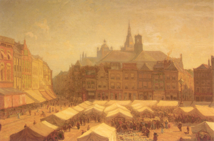 Op de Bossche Markt, daar is het allemaal begonnen toen ruim achthonderd jaar geleden er zich een nederzetting vormde. Binnen het territoir van het landgoed Orthen ontstond een handelsnederzetting die in het begin geen naam had. 'De nieuwe stad' of 'de nieuwe stad bij Orthen' was haar eerste benaming. Later kwam de naam 's-Hertogenbosch naar 'het bos van de hertog' pas naar voren. Maar of er echt een bos heeft gestaan? De Brabantse hertog was in ieder geval wel daadwerkelijk betrokken bij de eerste levensfase van de nieuwe stad. Gesticht als een combinatie van een handels- en vestingstad kwam Den Bosch als snel tot bloei. Nog geen halve eeuw na haar stichting, nog geen kwart eeuw na de realisering van de stadsmuren en poorten werd een kerkgebouw (de in romaanse stijl gebouwde Sint Jan) buiten de stadswallen gerealiseerd. Maar de Markt bleef het centrum van de handelsnederzetting. Hier werd de meeste handel gedreven. En natuurlijk werden de transacties beklonken met een glas. In het oudste Bossche stadsrecht was zelfs bepaald dat een Bosschenaar die de wijnman niet kon betalen, dit de volgende dag vóór twaalf uur ook mocht doen. Dat betekent dat de Markt al snel tal van herbergen, dranklokalen en hotels kende. In het verleden waren er zelfs méér dan nu. Want is de oude Gouden Leeuw niet driekwart eeuw geleden verdwenen? En sloot het befaamde hotel Noord-Brabant niet 25 jaar geleden haar deuren? De koffiehuizen zijn er niet meer en ook de sociëteiten Amicitia en De Arend verdwenen van het marktplein. Maar inderdaad: nieuwe cafés kwamen ervoor in de plaats. Andere zaken aan de Markt hadden eveneens een duidelijke relatie met wat zich op het plein afspeelde. De boeren en boerinnen konden nadat zij hun producten uit de Meierij verkocht hadden, zich ondermeer de petten van Boelens aanschaffen. Hun producten verkochten zij niet alleen in kraampjes op de Markt, maar ook in de kelders, waar op andere dagen de kramen opgeslagen lagen. En deze kelders waren groot, zo groot zelfs dat er in de achttiende eeuw volgens de overlevering paarden en karren in konden rondrijden. Maar in de 20e eeuw werden zij voor een deel dichtgegooid. Ondermeer omdat er eens een vrachtauto doorzakte. In vroeger eeuwen kende Den Bosch verschillende soorten markten. Deze vonden niet allemaal op de Markt zelf plaats. De bekendste is vanzelfsprekend de veemarkt, maar ook de vismarkt is lang elders gehouden. Thans is het vijf dagen in de week markt. Op dinsdag en donderdag een kleinere groenten- en fruitmarkt. Op de vrijdag aandacht voor vis en biologische producten. Op de woensdag en de zaterdag de grote markt, die vooral op de zaterdag tienduizenden naar het stadscentrum trekt. Er gebeurt méér op het plein. Eens per jaar is er kermis, en gedurende drie dagen wordt er carnaval gevierd. Regelmatig staat er een grote demonstratiewagen het een en ander aan de man te brengen en soms vinden er sportieve activiteiten plaats. Ook deze zijn aan veranderingen onderhevig: het spuitvoetbal maakte plaats voor beach-volleybal. En de horeca profiteert daar ook van. En maakt graag gebruik van de mogelijkheid om vóór de zaak een terras te realiseren. De Markt in Den Bosch leeft. Al achthonderd jaar en ze zal nog lang het kloppende stadshart blijven. |
