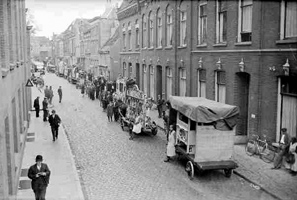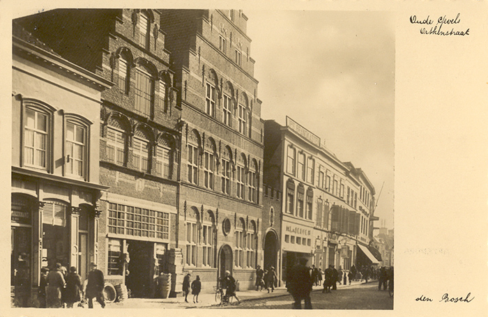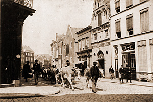 Dieren op straat. Je ziet ze tegenwoordig niet zoveel meer. Natuurlijk nog wel veel honden en katten, maar andere soorten? We weten, dat er in de middeleeuwen varkens en kippen op straat liepen. Huisdieren als honden waren er niet veel en er werd streng tegen opgetreden. Bedeelden mochten een hond niet als huisdier hebben, honden werden regelmatig (letterlijk!) de kerk uitgejaagd of van de kerkhoven waar zij botten opgroeven. Koetsiers waren evenmin op honden gesteld, omdat zij de paarden nogal eens lieten schrikken waardoor deze op hol sloegen. Honden hadden ook een nuttige functie: in de 19e en het begin van de 20e eeuw reden er hondenkarren door de Bossche straten. Paarden kende de stad veel. Vele koetsen en karren werden door deze dieren getrokken en ook de cavalerie in de stad beschikte over paarden en bezat diverse stallen. Maar wist U dat de binnenstad van Den Bosch ook leeuwen heeft gehad? Jaarlijks sloeg aan het eind van de vorige eeuw Oscar Carré zijn circustent op de Markt op en daar waren leeuwen bij. Bij de trammaatschappij klaagde hij over de stoomtram: zijn leeuwen schrokken daar hevig van. Maar toen de stoomtractie weer vervangen werd door paarden, was de reactie andersom: de paarden weigerde de Markt te passeren omdat zij de leeuwen roken. De aanwezigheid vanaf het midden van de negentiende eeuw van een zich steeds uitbreidende veemarkt in de stad zorgde ook voor een toevoer van andere dieren: varkens, koeien, schapen en geiten. Meestal gingen deze lopend van het dorp waar zij vandaan kwamen naar de veemarkt om er verhandeld te worden. Zo waarschijnlijk ook het groepje dat op de foto te zien is. De foto is gemaakt op de hoek van de Visstraat en de Orthenstraat. Slechts enkele panden zorgen voor een herkenning. Geheel rechts op de foto was tot de eeuwwisseling de Gebroeders Verhees, Schilders, gevestigd. Daarnaast bevond zich het 'ijzermagazijn' van Louis van Miert in het pand De Gulden Hopsack. Beide panden zijn thans in het bezit van Van Lanschot Bankiers. Het eerste gebouw hebben zij afgebroken en door een ander, oud aandoend kantoorgebouw laten vervangen. De Gulden Hopsack is gerestaureerd. Het lage pand tussen het Eerste en het Tweede Straatje van Best bevatte aan het eind van de vorige eeuw nog de gruttersmolen van De Gruyter: hier was hij de uitbreiding van zijn winkel gestart, in het begin van de 20e eeuw zou aan de overzijde in de Orthenstraat zijn grote groei beginnen. Het kleine pandje werd toen verkocht, afgebroken en in 1905 vervangen door het huidige gebouw dat nu eveneens huisvesting biedt aan de Bankiers maar as een schoolgebouw was opgericht. Verderop in de straat is het stadsbeeld nog meer veranderd in de laatste eeuw. En de dieren op straat: slechts af en toe is er politie te paard aanwezig. De paardenhopen laten hun aanwezigheid ook de dag erop nog zien. En die hopen zullen er in de vorige eeuwen wel méér geweest zijn in de Bossche binnenstad. |