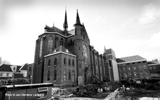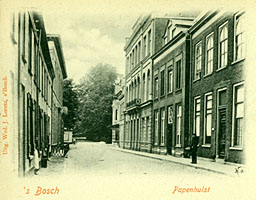 Het is een van de Bossche Straten waar men niet zo vaak komt: de Papenhulst. In de vijftiende eeuw heette deze straat Wevershulst en tot 1629 woonden hier vele kanunniken en andere geestelijken. Tevens bevond zich hier, in de Herenkelder, hun wijnvoorraad. Na 1629 woonden zij hier niet meer, maar de in de volksmond gegroeide naam 'Papenhulst' werd officieel. Het huidige Nachtegaalslaantje behoorde er eveneens toe. Opmerkelijk is dat de geestelijkheid, 'de papen', teruggekeerd zijn in de Papenhulst in de twintigste eeuw. Aan de westzijde groeiden de scholen van de Zusters van de Choorstraat (De Congregatie der Dochters van Maria en Jozef) en aan de oostzijde hadden de Fraters van Tilburg een klooster (1928) en de Broeder van Barmhartigheid van Johannes de Deo een ziekenhuis (1914). Aan de oostzijde van de Papenhulst, vlak bij de Binnendieze, bevond zich het gebouw van de Sociëteit Casino (op de foto met de luifel). Deze Sociëteit organiseerde concerten en bals in een houten tent en vanaf 1853 in een stenen schouwburg. Nu konden er ook toneelvoorstellingen gegeven worden en werden ter financiering van het geheel grote carnavalsbals gehouden: de herleving van het Bossche carnaval. Hoewel de zaal inmiddels vergroot was, bleek zij in de twintigste eeuw te klein. De Sociëteit verhuisde daarom in 1935 naar een nieuwe ruimte aan de Parade, waar velen het Theater aan de Parade nog kennen als Het Casino. Naast de zaal van de Sociëteit bevond zich in de negentiende eeuw de Normaalschool. Dat was een rijksinstelling voor de opleiding van onderwijzers. Ondermeer de bekende zanger Orelio en de kunstenaar Antoon der Kinderen volgden hier na hun lagere school een vervolgopleiding. In het laatste decennium van de vorige eeuw ontstond een schoolstrijd in de stad, inzet van de gemeenteraadsverkiezingen. De vraag was: moest er een openbare, neutrale school komen voor de opleiding van onderwijzers, of een katholieke? De katholieken in de gemeenteraad wonnen: de Bisschoppelijke Kweekschool werd opgericht en de Normaalschool verhuisde naar Nijmegen. Vanuit de Choorstraat hadden de scholen zich inmiddels uitgebreid. De 'Zusters van de Choorstraat' hadden er een kleuterschool, een lagere school, een ulo en een opleiding voor onderwijzeressen. Langzamerhand hadden deze scholen zich uitgebreid tot de gehele oostzijde van de Papenhulst. De scholen zijn inmiddels verdwenen, opgegaan in een basisschool in Zuid, in het Sint-Janslyceum en in de Fontys-PABO. Tot voor kort maakte het Koning Willem I College nog gebruik van de lokalen. De gevelwand is sterk aan verandering onderhevig. Aan de zijde van de Binnendieze treft men garages aan, voor de in het klooster wonende religieuzen. De scholen zijn voor een deel gesloopt om plaats te maken voor appartementen. Slechts één historisch gebouw is blijven staan. Het is het pand waar gedurende enige tijd tijdens de Tweede Wereldoorlog het Joods Lyceum was gevestigd. Hier werden alle joodse docenten en leerlingen uit de gehele provincie samengebracht om les te geven en onderwijs te krijgen. Velen van hen hebben de bevrijding niet meegemaakt. |