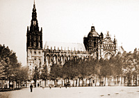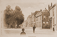 In de middeleeuwen kende Den Bosch geen Parade. Het plein was een druk Begijnhof waar in de middeleeuwen honderden, begijntjes hun rustige leven leidden. Een paradeplaats vol rumoerige militairen was het in de 18e en 19e eeuw. In de jaren dertig verdwenen de kazernes met soldaten uit de Bossche binnenstad. De rust keerde terug op het plein. Een rust die ruim dertig jaar duurde, tot de jaren zestig. Op de foto, die rond de eeuwwisseling gemaakt moet zijn, zien we uiterst rechts nog een huis. Dat had er eigenlijk niet moeten staan volgens het Bossche kerkbestuur van omstreeks 1500. Want die hele westwand van de Torenstraat had men juist aangekocht. Er werd toen druk gewerkt aan de Sint-Jan en het was de bedoeling om het schip van de kerk zó uit te bereiden dat hier de twee nieuwe grote westtorens gebouwd zouden worden. Echter, de economie van de stad liep in het begin van de 16e eeuw sterk achteruit en de bouwplannen werden niet gerealiseerd. In plaats daarvan kreeg de romaanse, van bakstenen gebouwde toren een gotisch bovenstuk. De kerk verkocht later haar bezittingen en thans wordt de hoek Torenstraat-Kerkstraat ingenomen door een bank. De Kerkstraat overstekend vanuit de Torenstraat kwam men in 1900 direct in de Peperstraat. Rustige huizen kenmerkten deze westelijke wand van het plein. In 1954 vestigde zich café De Bonte Os op de hoek Kerkstraat-Parade. Dit café, dat later omgedoopt zou worden in het Hart van Brabant, kreeg in 1961 gezelschap van 't Pumpke. Maar er veranderde meer, véél meer. De gemeente nam de omgeving drastisch 'onder handen'. De bomen sneuvelden, de straat werd in oostelijke richtig verlegd en de stoep aan de westzijde van de Parade werd flink verbreed. Deze werd door het steeds groeiende aantal cafés in gebruik genomen als terras. Op verzoek van de café-eigenaren werden deze terrassen tenslotte veranderd in 'winter-terrassen', in feite een uitbreiding van het café zelf, want er verschenen opnieuw tafels en stoeltjes op de resterende stoepruimte. Zo veel zelfs, dat gewone passanten de verbrede stoep niet meer ongehinderd kunnen passeren. Dit deel van de Peperstraat, tussen Kerkstraat en Lange Putstraat, kreeg in 1967 een nieuwe straatnaam: Parade. Genoemd naar het grote plein. Het plein werd nu meer betrokken bij diverse activiteiten in de stad. Ondermeer Jazz in Duke Town, de Boulevard en het Bevrijdingsfestival zorgden voor leven op het plein, maar ook voor muziek. En als het plein niet als zodanig in gebruik is, dan vult de muziek uit de vele cafés de straat en het plein, dat dan vol met blik staat. De toekomst van het plein de Parade ligt ter discussie. Er zijn Bosschenaren die er een 'plein van stilte' van willen maken. Maar of de rust van 1900 ooit terugkeert? En zal de recht doorgaande straat Torenstraat - Parade - Peperstraat weer zijn oude loop terugkrijgen? We zullen het allemaal in de 21e eeuw wel zien hoe het afloopt. |