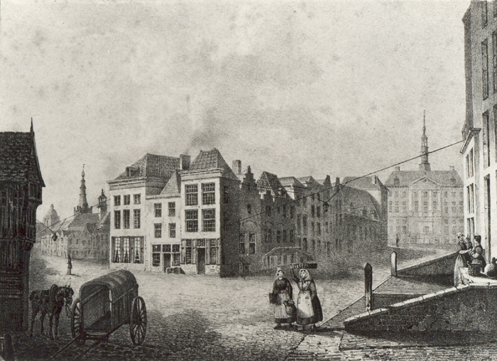 Uit het bovenstaande blijkt dat Jan de Joede al in 1390 een kamer ten noorden van de zojuist genoemde bezat. Op 29 juli 1398 verkreeg hij van Hendrik Goiartsz. Dicbier nog twee van deze grondstukjes van 9 voet breed en 11 voet lang.18 Hij heeft dus waarschijnlijk minstens drie van deze perceeltjes verworven.19 Het noordelijkst gelegen deel van het hele in 1365 verkavelde en uitgegeven complex werd op 26 mei 1417 omschreven als twee kamers, 'gelegen tussen het erf van Diederik Jansz. aan de ene en tussen de kamer met haar ondergrond aan Peter de Joede zoon van wijlen Peter toebehorend aan de andere kant, strekkend van de voornoemde Markt tot het minderbroedersklooster'. Deze kamers waren afkomstig van Aart Volken en werden toen door Reinier Schaden, die ze door middel van een schepenvonnis verkregen had van Jacob van Geel, verkocht aan Jan Reymbrant.20 In totaal zal het dus oorspronkelijk om minstens negen kaveltjes zijn gegaan, waarvan er echter al snel telkens twee of drie in één hand zullen zijn gekomen. Afzonderlijk waren ze ook wel erg smal, in ieder geval te smal om er een woonhuisje van te maken. WisselkantoortjesUit een oorkonde van 11 juni 1437 blijkt dat toen op de twee noordelijkst gelegen perceeltjes wisselkantoren waren geves- | 5 |